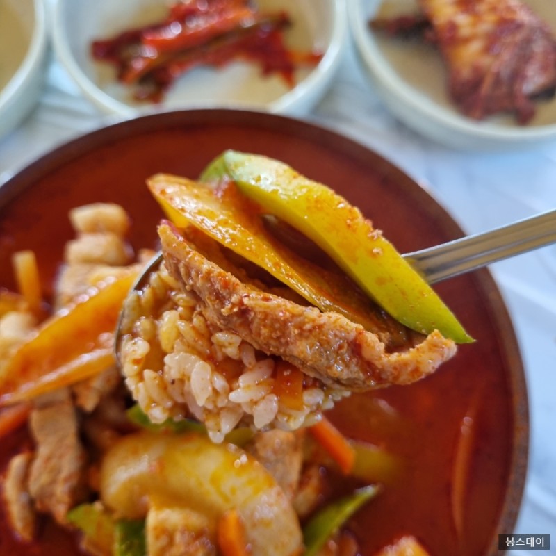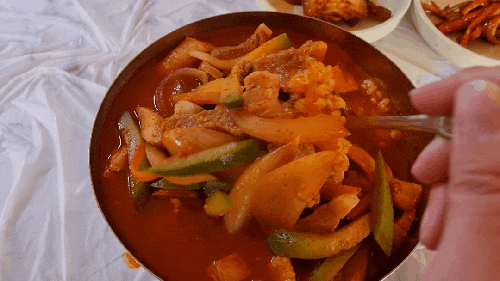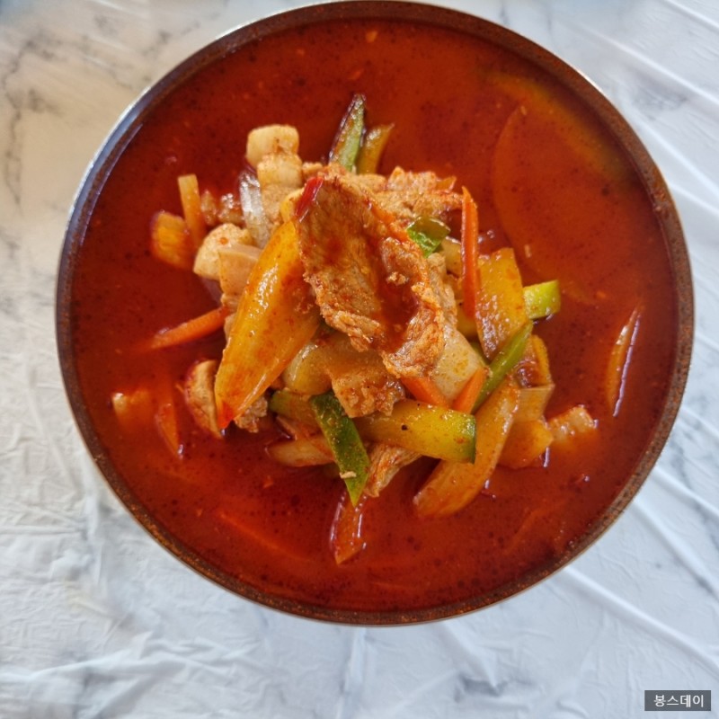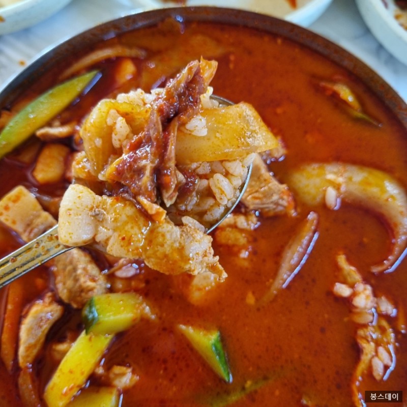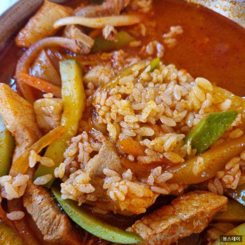 살코기와 비계가 적절히 붙어있고 밥, 애호박, 당근, 양파 등을 넣어서 고추장 양념이 베이스인 옛날 국밥식입니다.