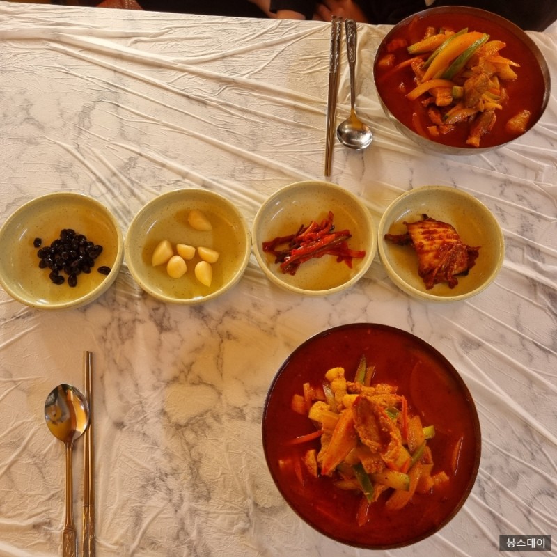 광주 노포 맛집 추천 명화식육식당의 기본 반찬과 오늘의 주인공 애호박찌개가 등장했습니다.