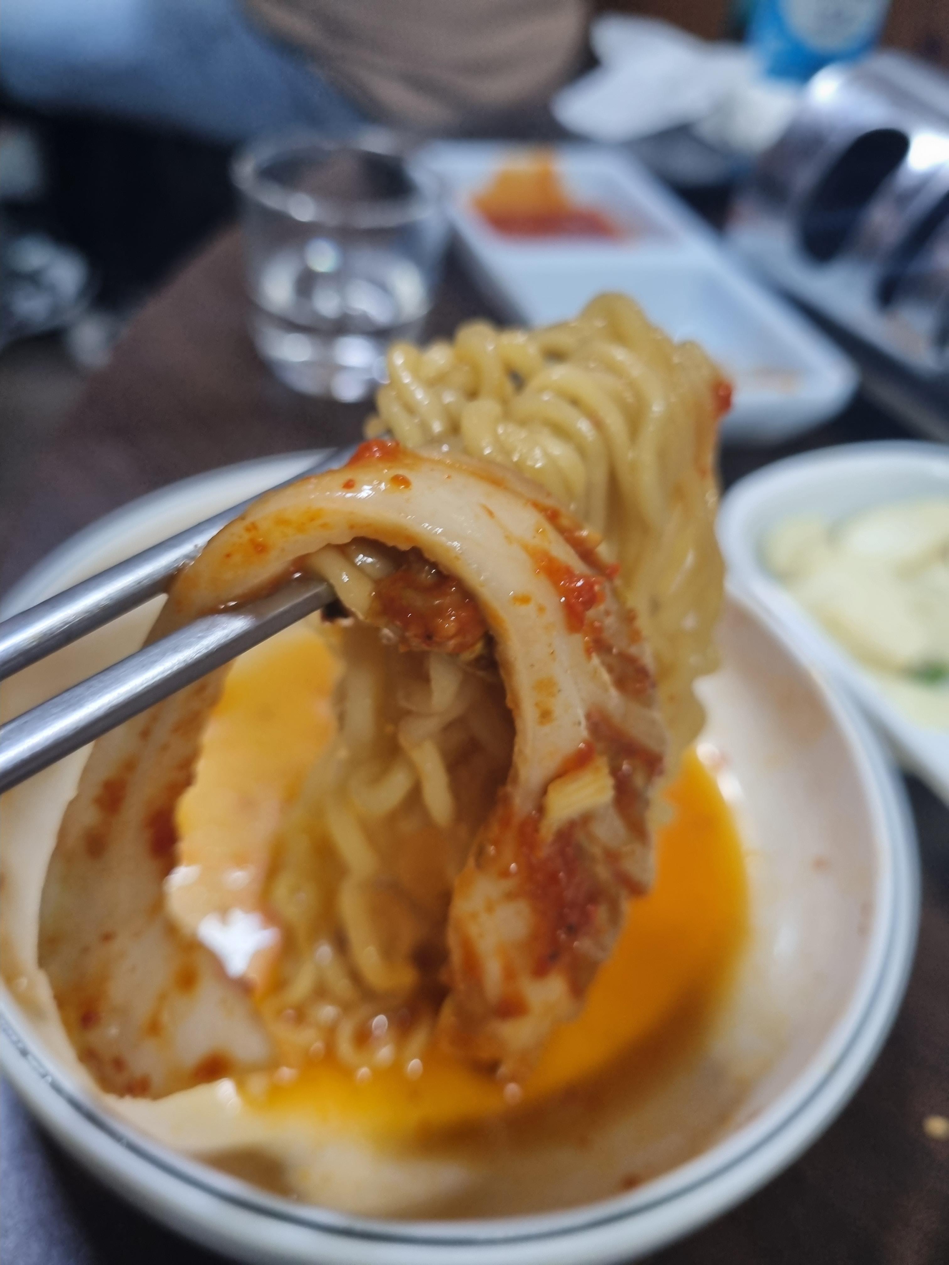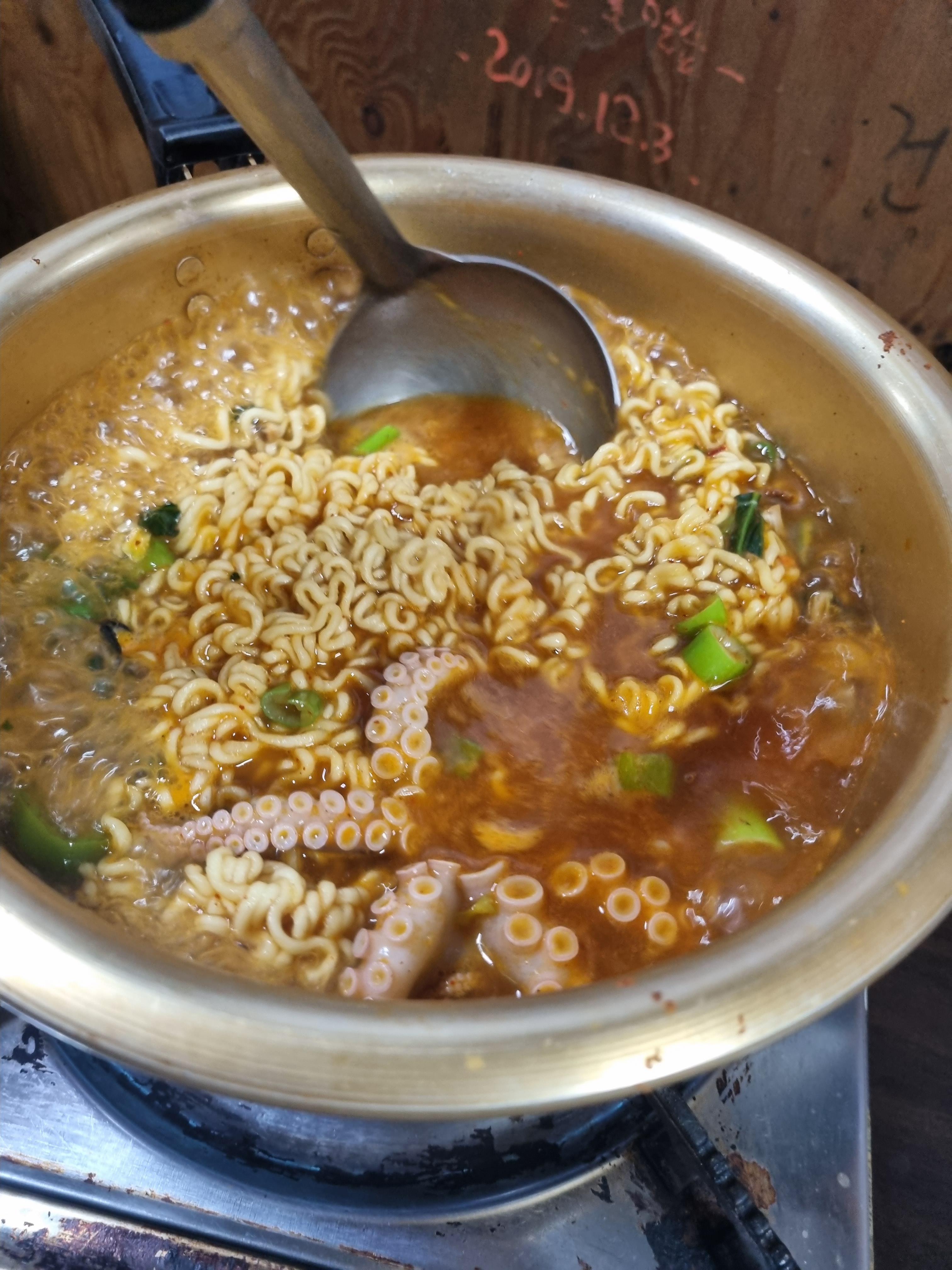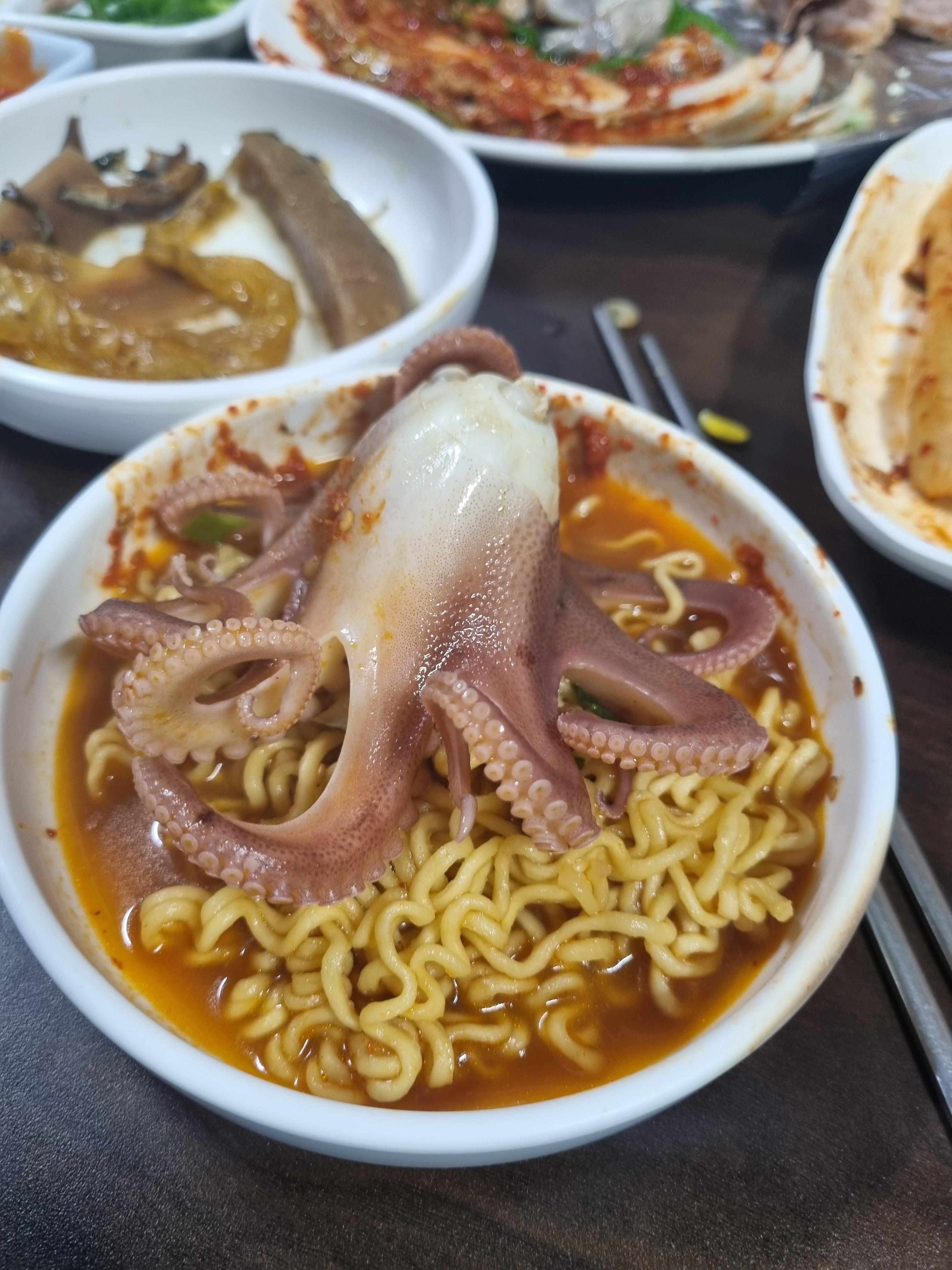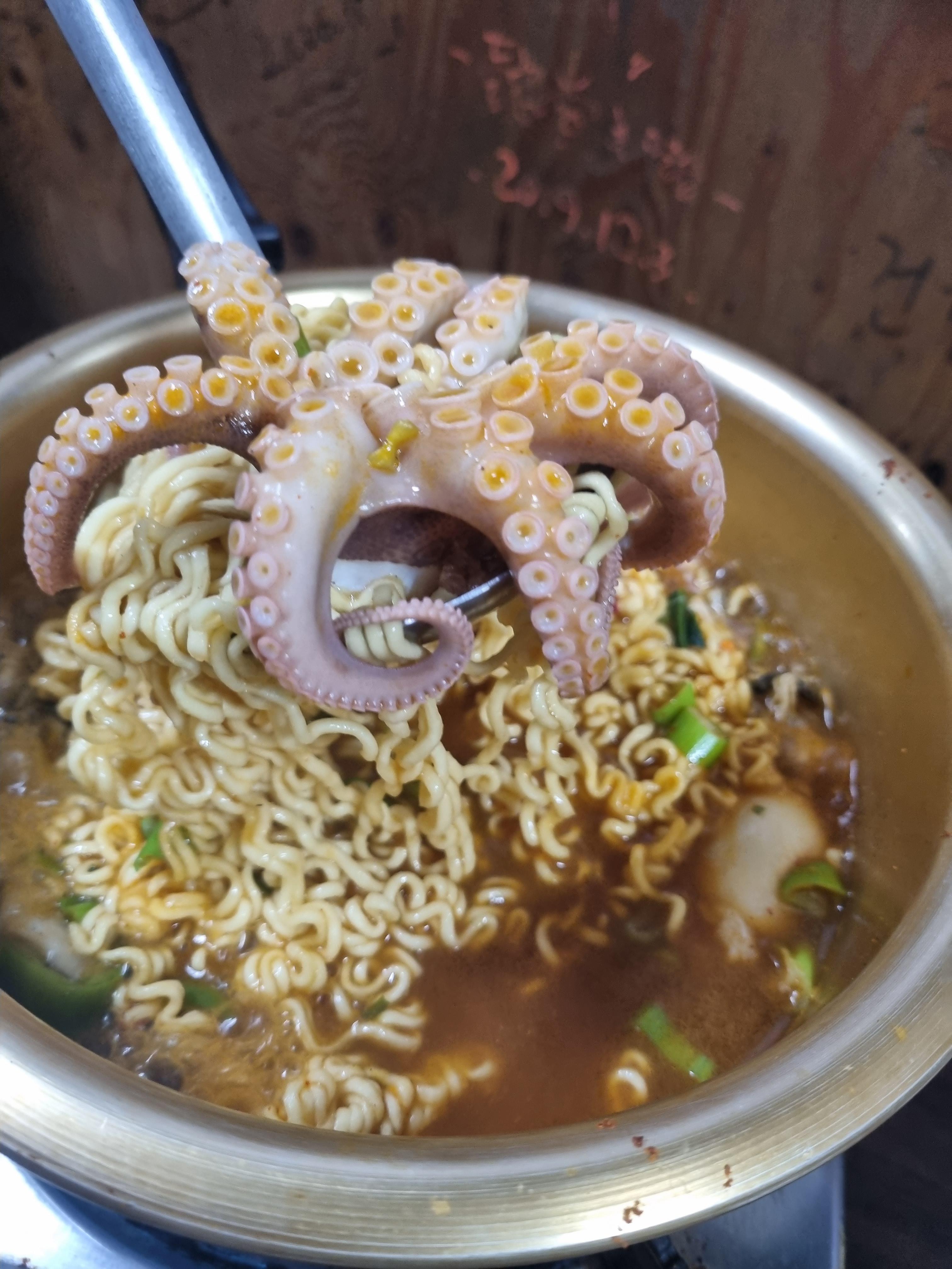 해물라면이 너무 궁금해서 주문해보았습니다. 라면은 신라면이고요. 정말 큰 문어와 굴을 아낌없이 넣어주셨어요. 해물라면은 1만원인데 라면 2봉이 들어가서 양이 은근히 많으니 인원이 많을 때 시켜야겠더라고요. 이모님 라면까지 완벽하게 끓일 줄 아심... 적당히 면발 덜 익히게 만들어주셔서 먹으면서 익히는 거 그거 아시죠??! 버너 위로 올려서 나오기 때문에 따뜻하게 먹을 수 있어서 참 좋았습니다.