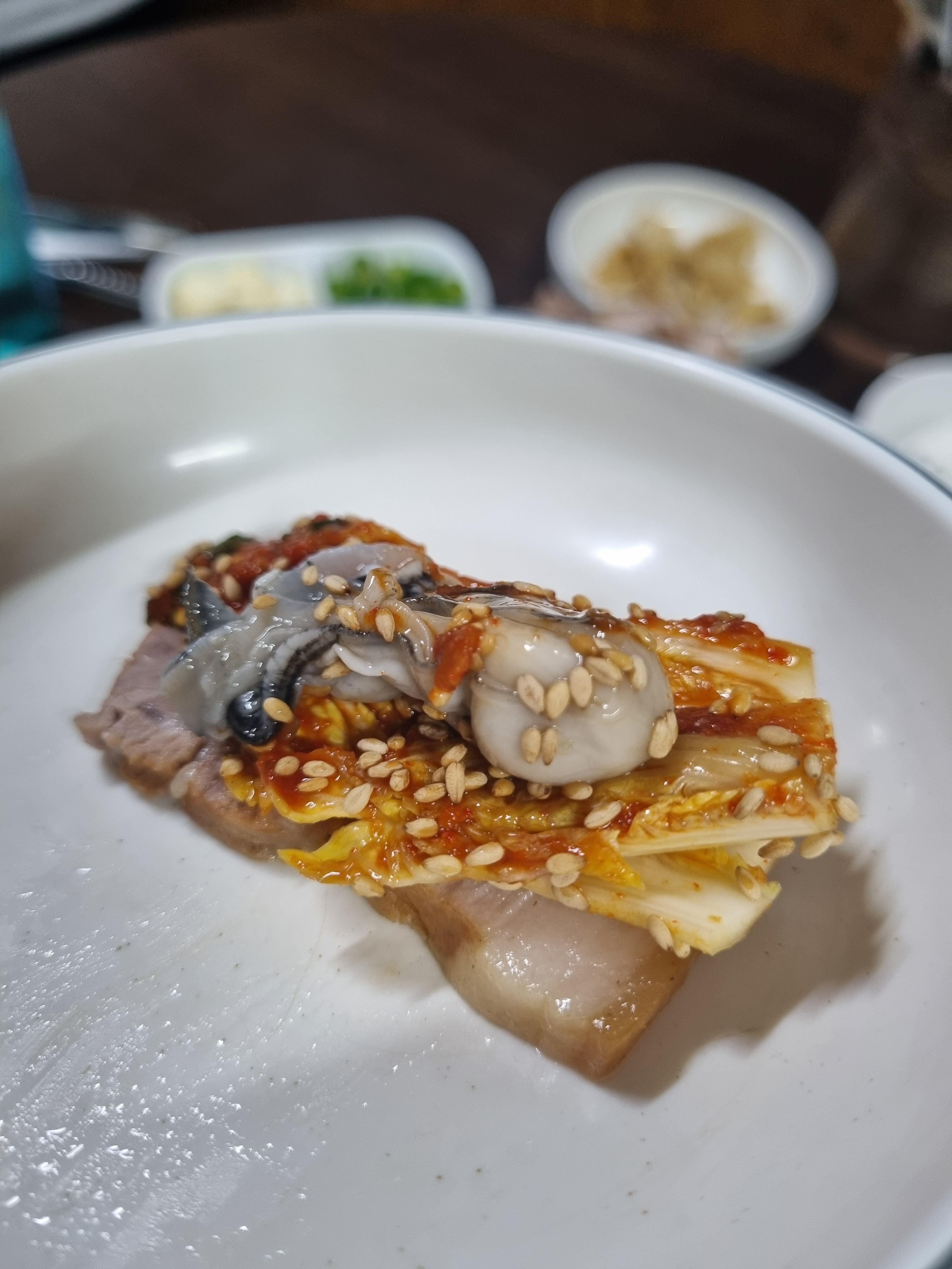 드디어 메인메뉴 생굴 수육보쌈이 나왔습니다. 중, 대 가 있는데요. 메뉴판에는 정확히 없지만 저희가 주문한 사이즈는 중 사이즈로 가격은 4만원이었습니다. 대 사이즈는 5만원이에요! 솔직히 가격이 좀 있는 편이네요. 정말 하나하나 모든 게 먹음직스럽게 보입니다. 싱싱한 굴, 냄새는 하나도 안 나는 수육, 밥만 있어도 맛있는 생김치, 두부까지! 위에 깨가 뿌려져 있어서 더욱 먹스럽게 보입니다.