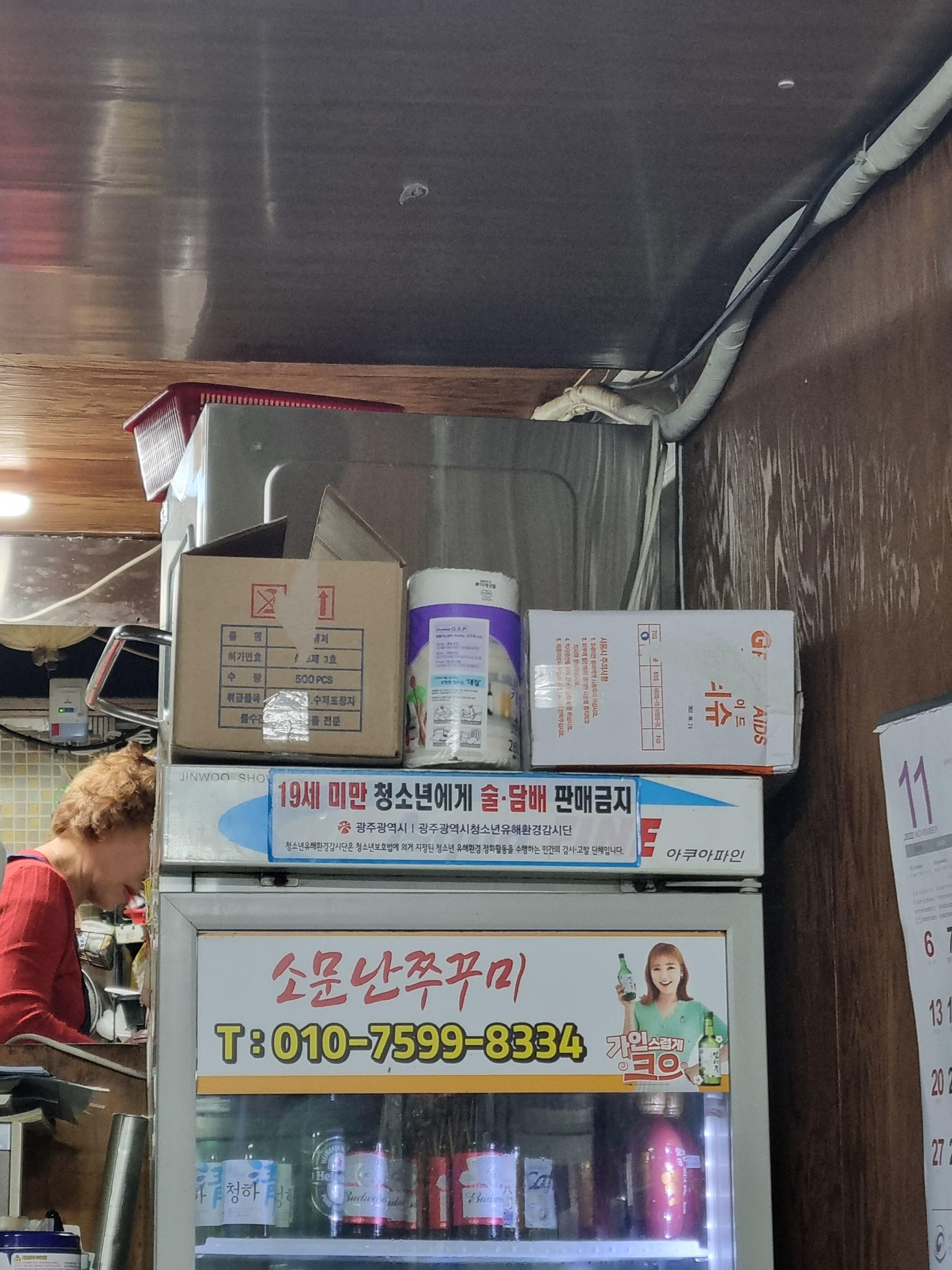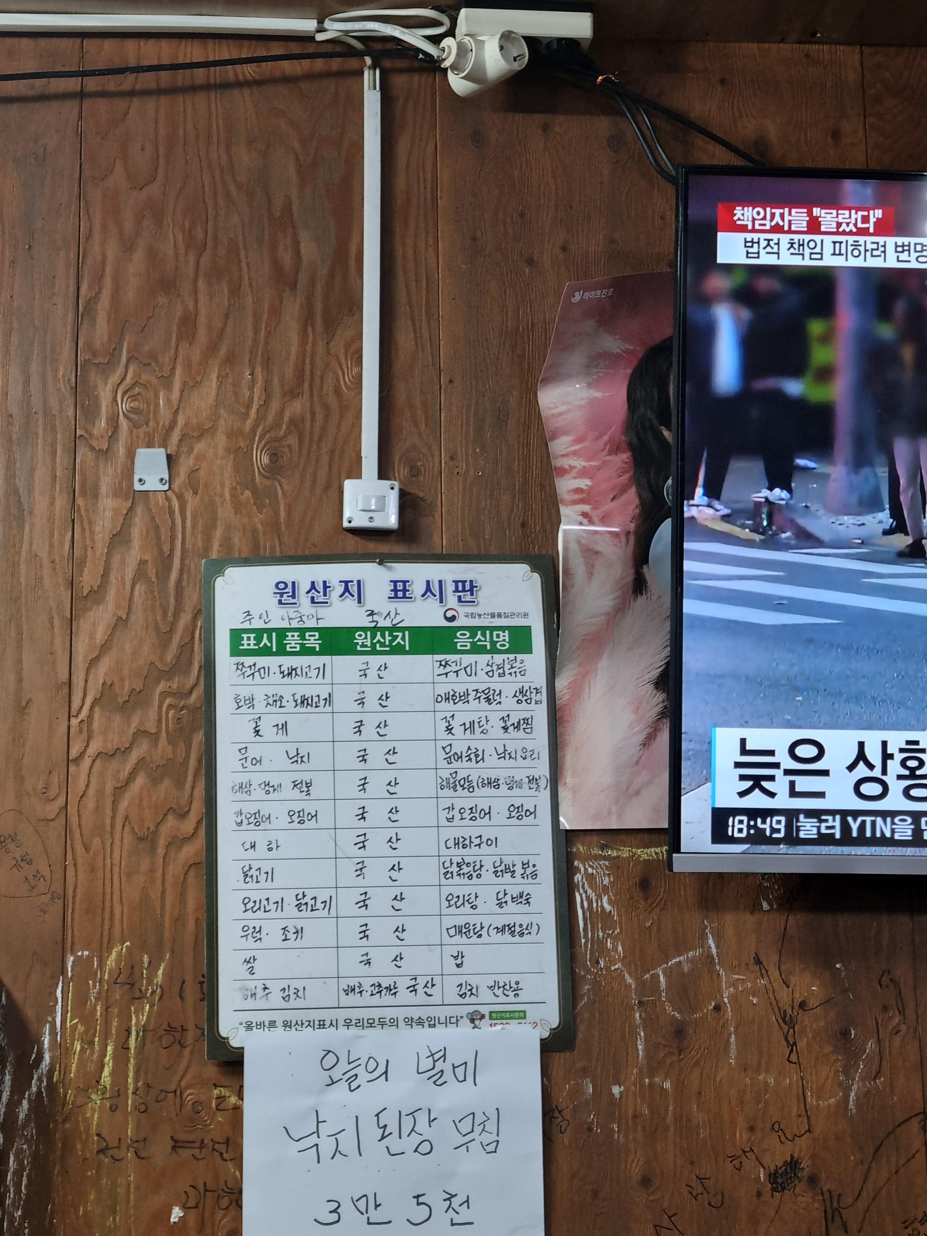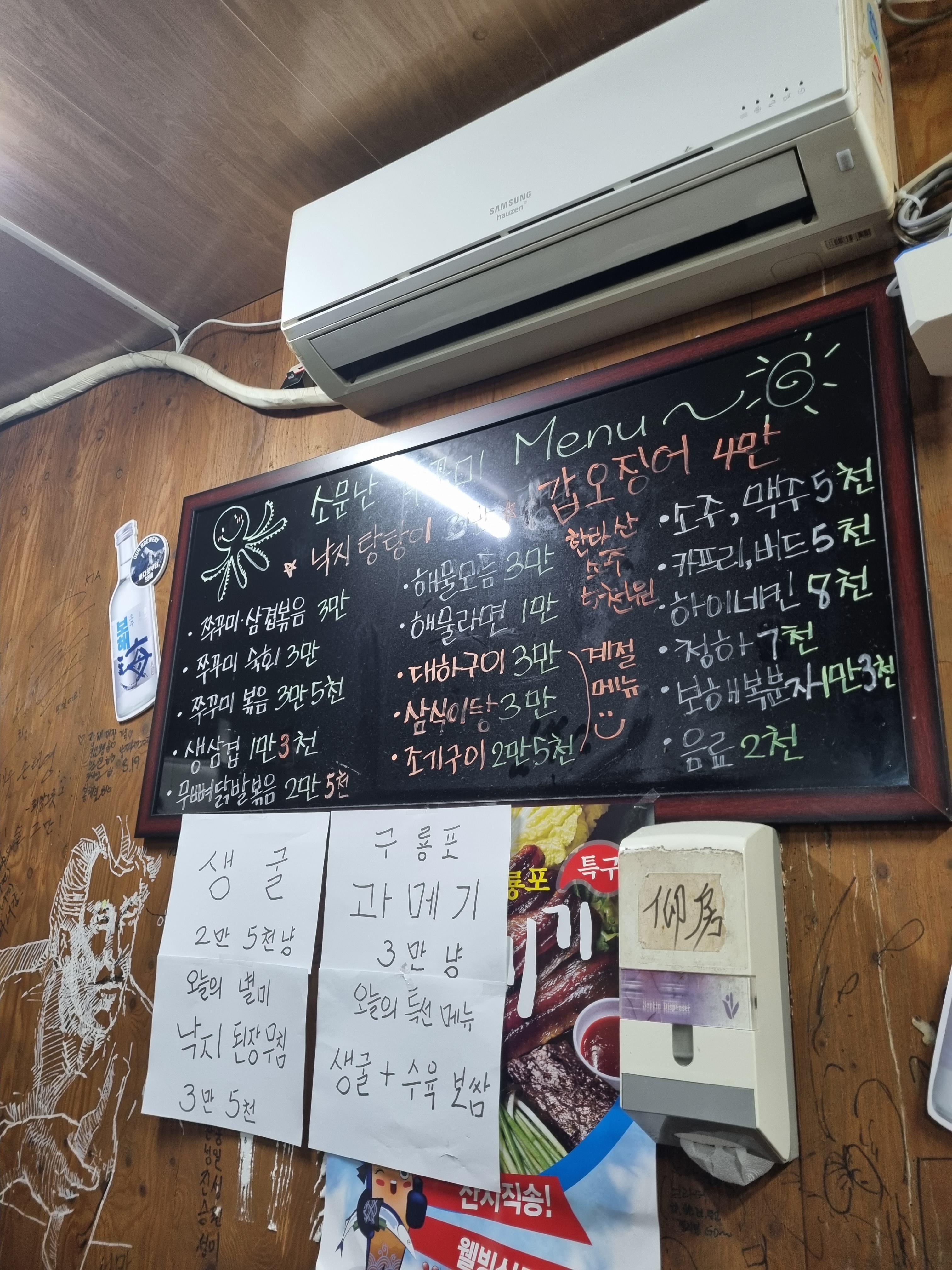 광주 구시청 맛집 소문난 쭈꾸미 메뉴판입니다. 낙지탕탕이, 갑오징어, 쭈꾸미 삼겹볶음, 쭈꾸미 숙회, 쭈꾸미 볶음, 생삼겹살, 무뼈 닭발 볶음, 해물 모둠, 해물라면, 대하구이, 삼식이탕, 조기구이, 소주, 맥주, 카프리, 버드, 하이네켄, 청하, 보해 복분자, 한라산까지! 주류들도 정말 다양하게 있고요. 지금 가야 먹을 수 있는 계절 메뉴 생굴이 있습니다. 오늘의 별미나 오늘의 특선메뉴도 있고 과메기까지 있네요. 원산지 표시를 보시면 전부 다 국내산을 사용하는걸 확인하실 수 있어요.