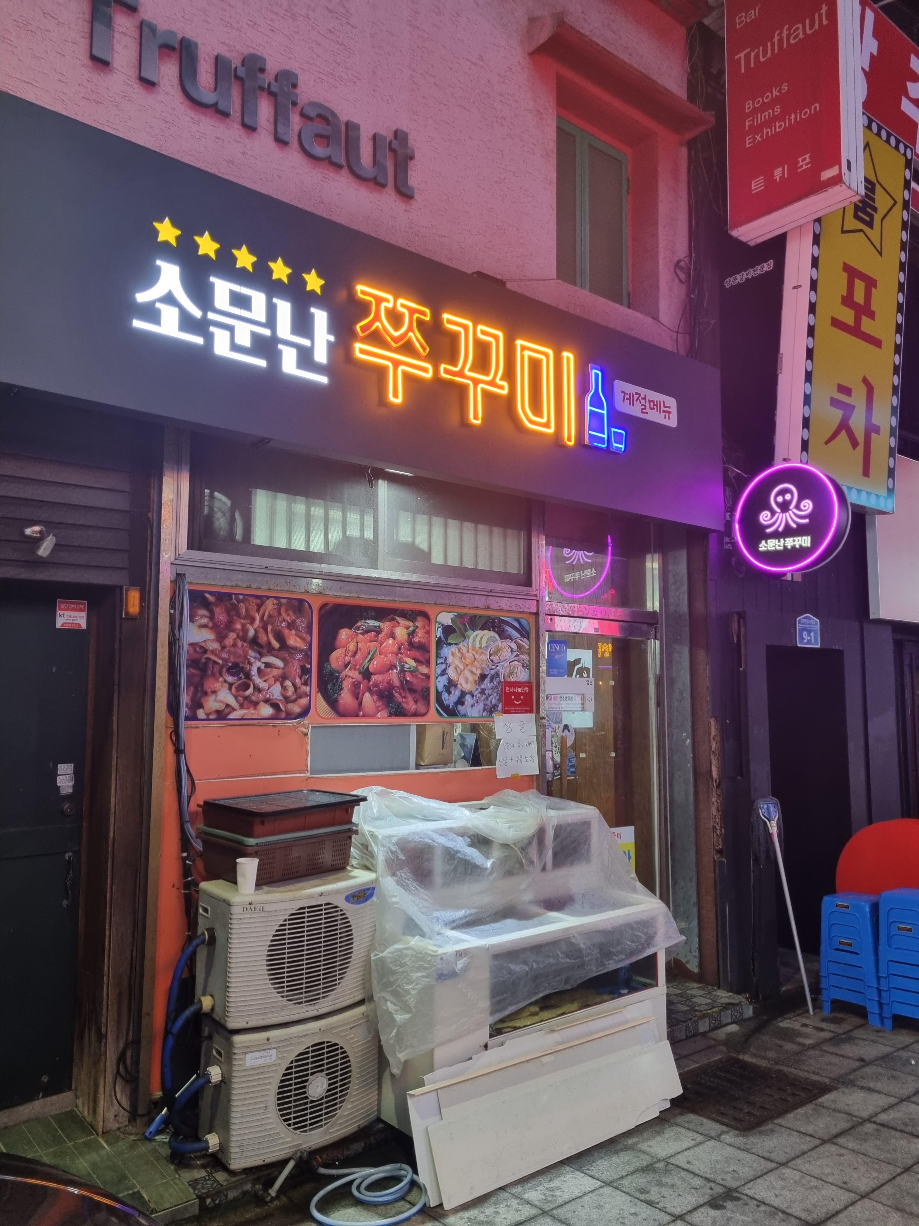 광주 구시청 맛집 소문난 쭈꾸미는 구시청 사거리에서 멀지 않은 곳에 있습니다. 근처로 곱창집만 두군데가 보이네요. 여기 매장이 얼마나 오래전부터 있었는지는 모르겠지만 간판을 새로 하셨더라고요. 뭔가 요즘 트렌드에 맞는 간판에 쭈꾸미 네온사인이 너무 귀염뽀짝하게 있습니다.
