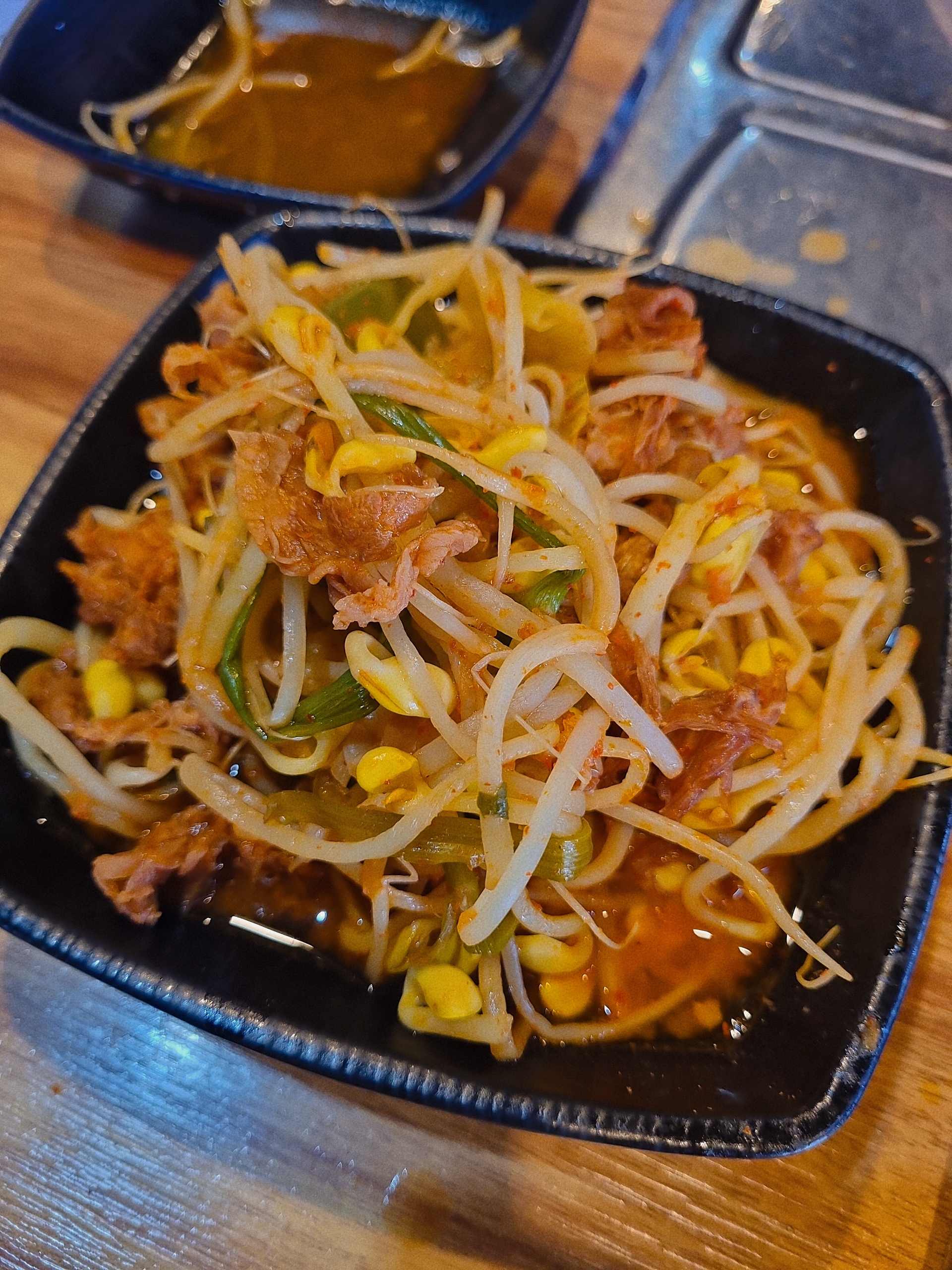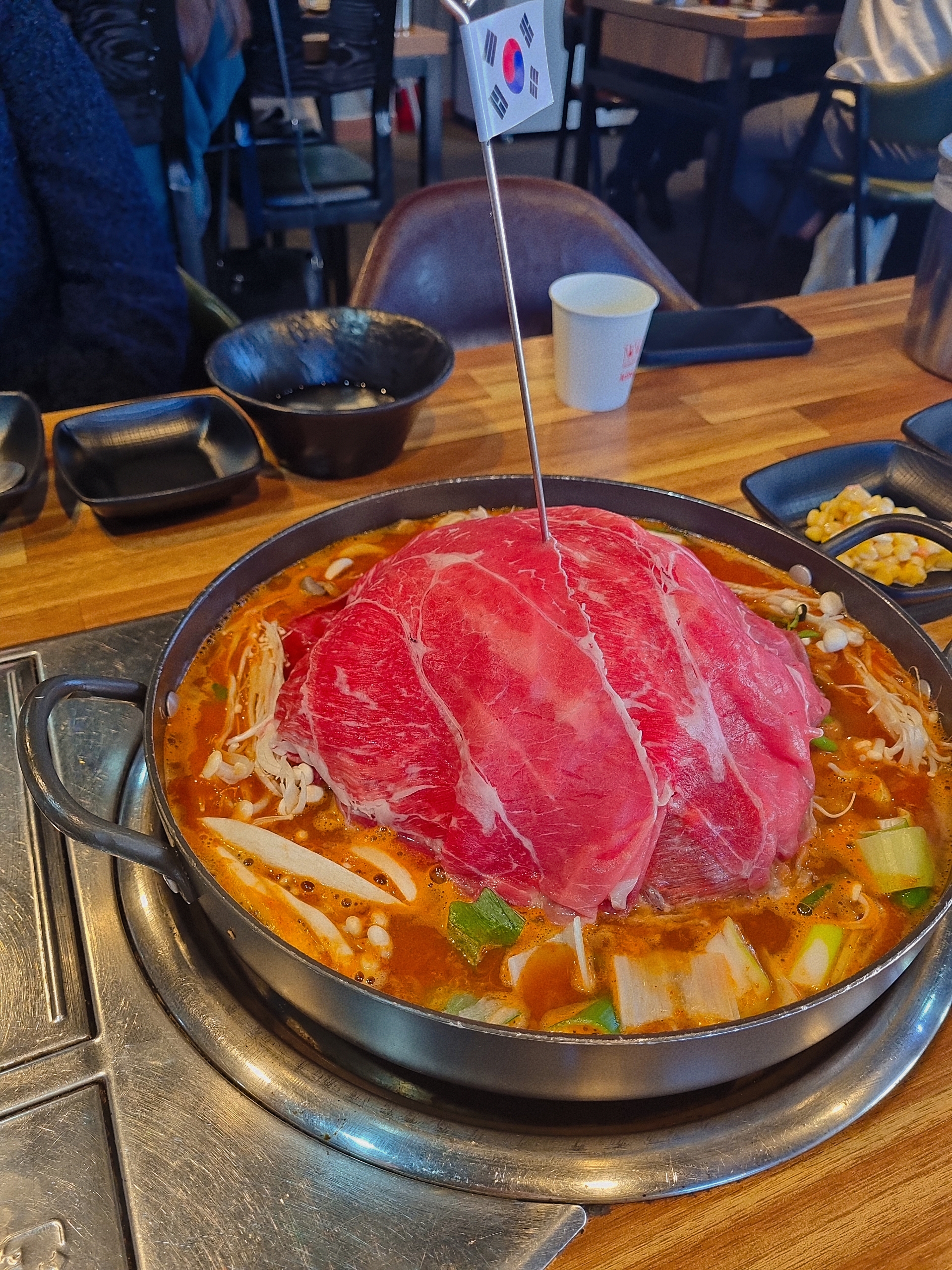 대망의 메인메뉴 점심특선 연남물갈비가 나왔습니다. 강력한 비주얼 덕분에 SNS에서도 인기가 상당하더라고요! 고기 위로 꽂힌 태극기도 뭔가 간지가 납니다. 이곳의 메인메뉴는 물갈비와 불고기인데요. 원래 맵기 조절이 가능한데 점심특선으로 주문할 때는 맵기 조절이 따로 불가능하고 1단계로 나옵니다. 1단계는 신라면 정도의 맵기입니다. 매운걸 못 드시는 분들은 차라리 불고기를 드시는 게 나을 수도 있어요!