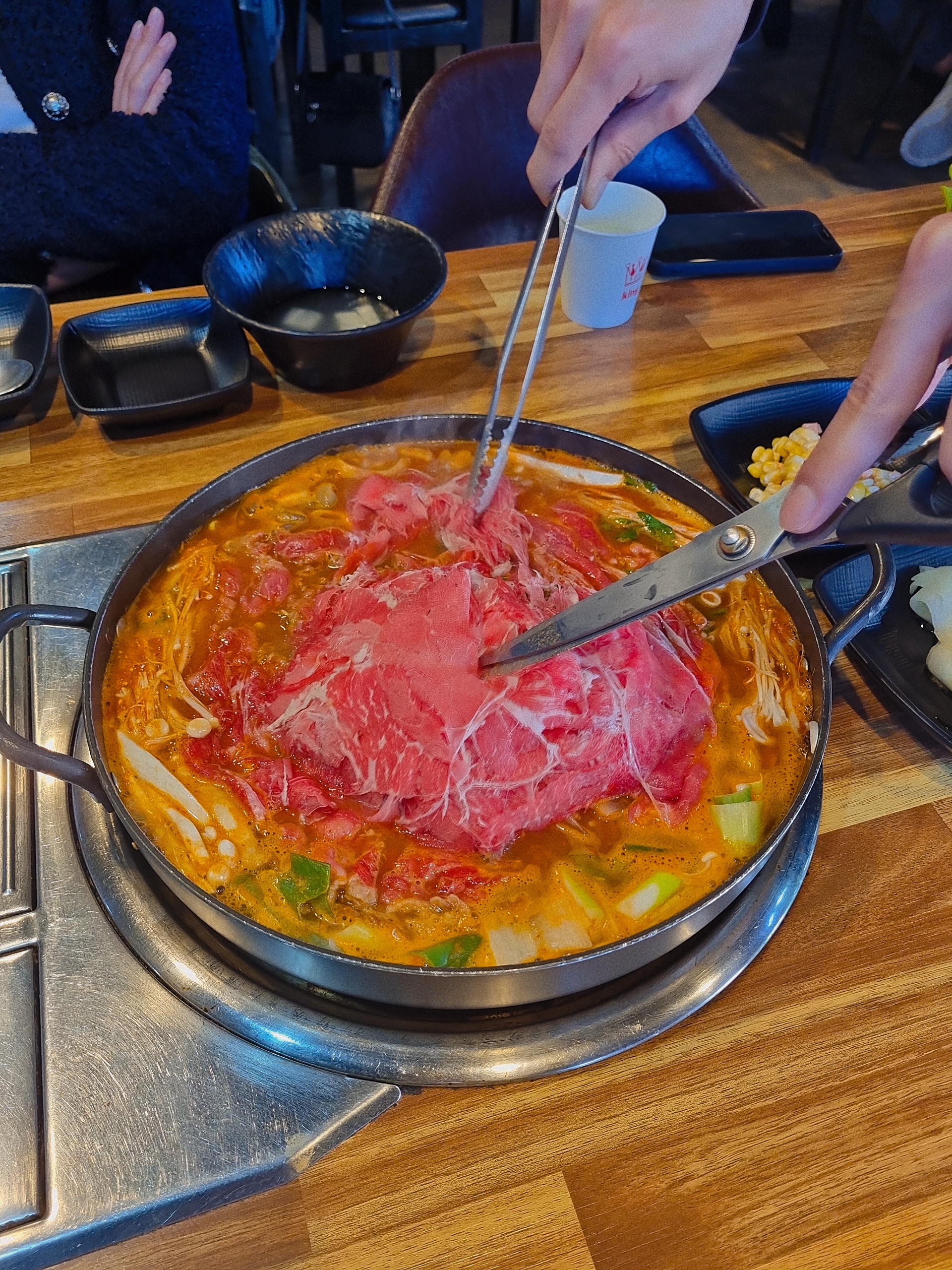 용봉동 맛집 연남물갈비는 처음 음식이 나올 때 직원분이 자세하게 설명을 해주셔요. 특별한 건 없지만 어느 정도 익다 보면 직원분이 직접 손질을 해주십니다. 먹기 좋게 가위로 잘라주시더라고요. 샤브느낌 나도록 고기와 숙주, 야채들과 함께 먹을 수 있도록 세팅해주십니다. 적당히 진한 국물과 살짝 얼큰한 정도에요. 국물맛이 진짜 좋아서 소주 생각이 바로 나는 맛입니다. 테이블에 준비된 독도소스에 찍어 먹으면 정말 맛있어요. 물론 안 찍어 먹어도 자체가 맛있습니다.