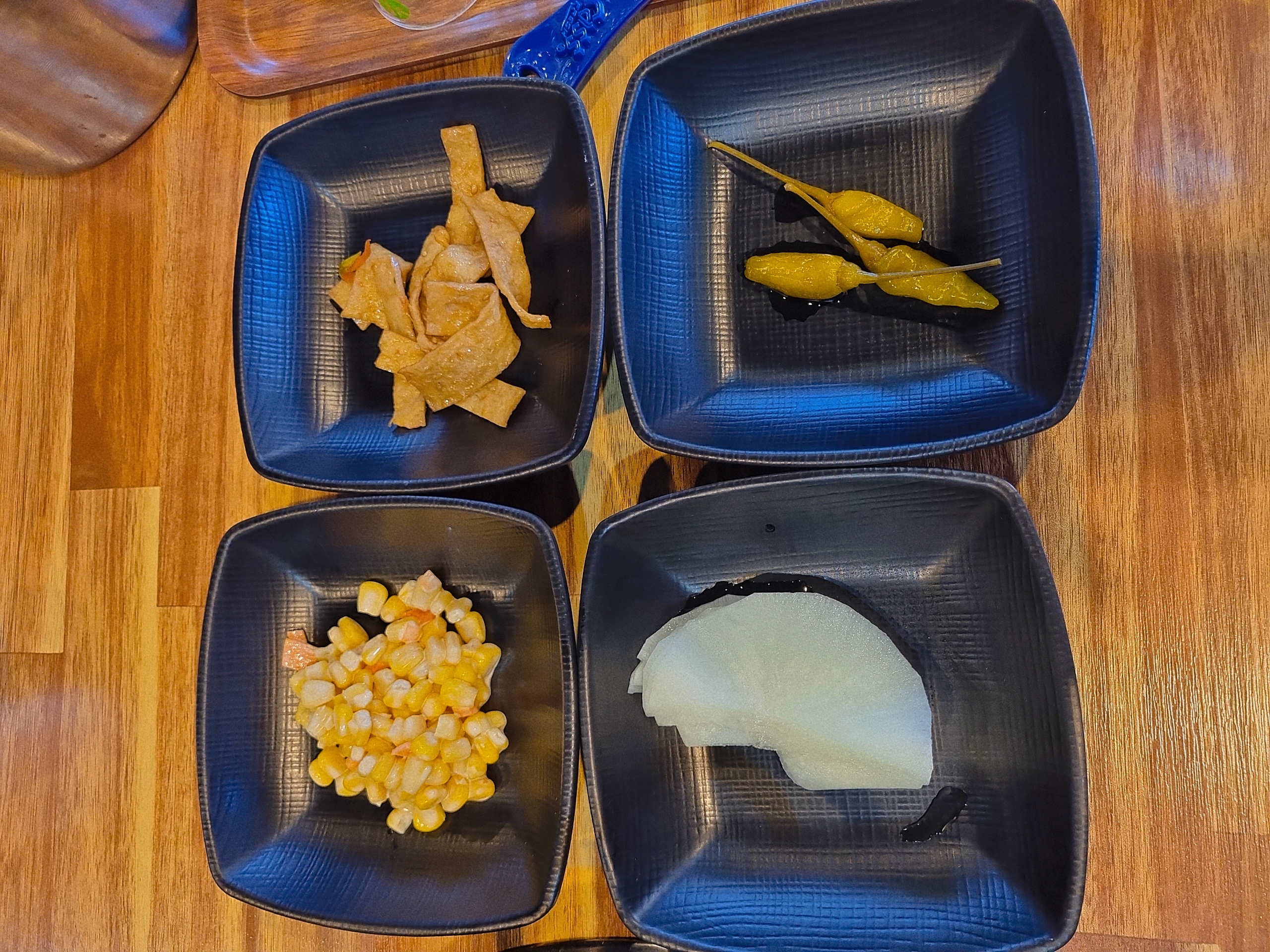 콘샐러드, 오뎅, 쌈무, 고추장아찌가 기본으로 나왔습니다.