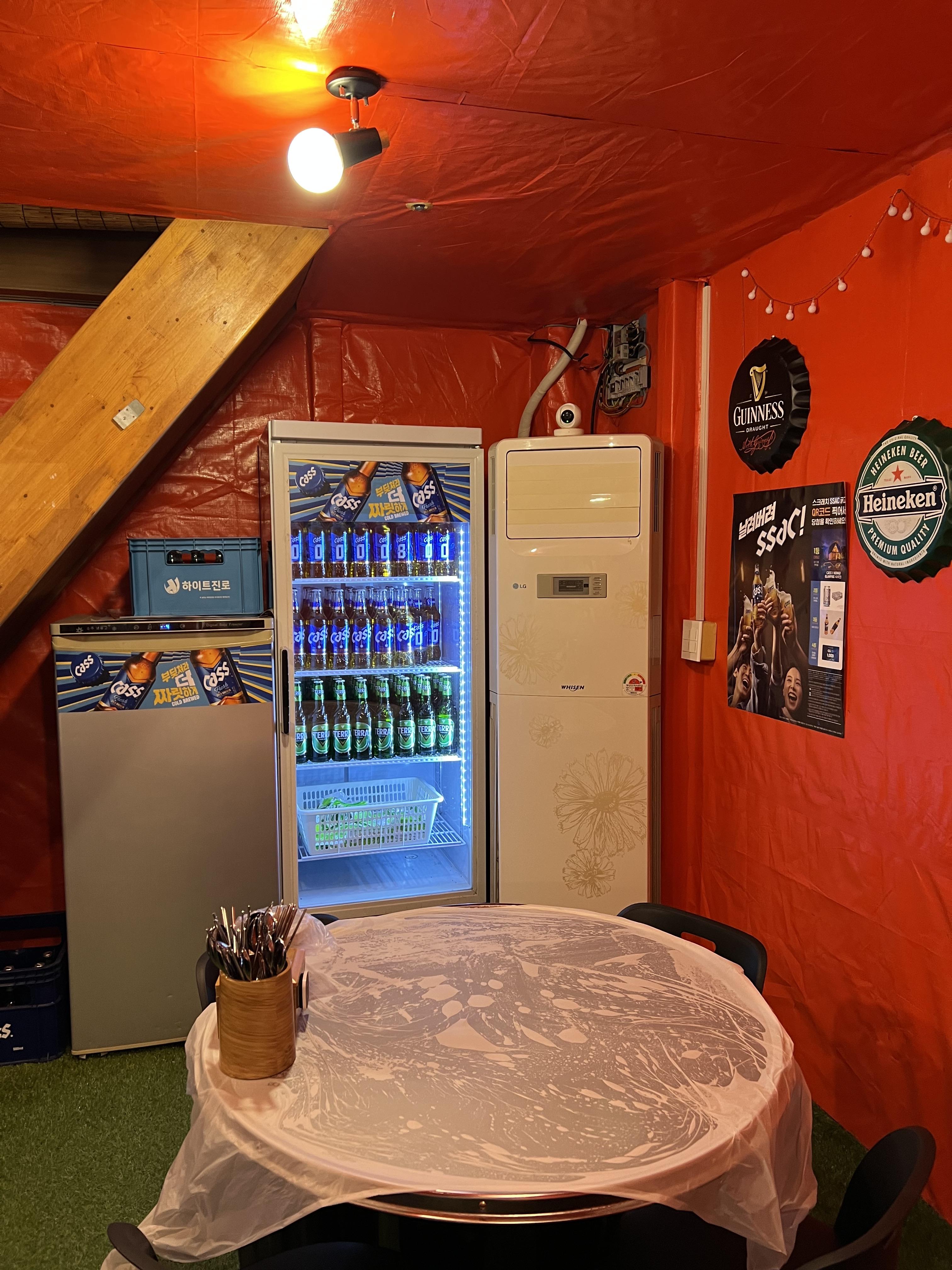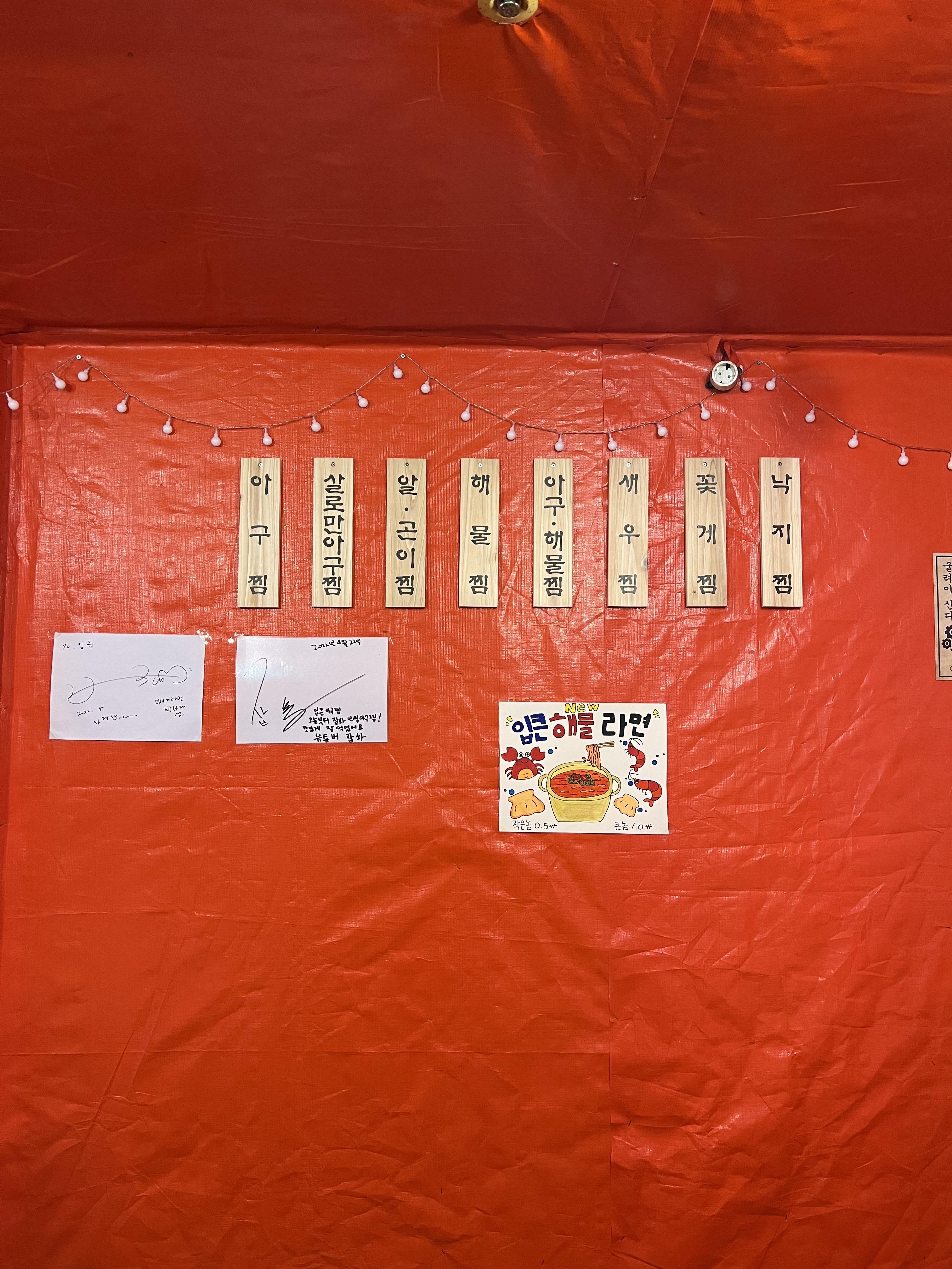 남악시장 맛집 입큰아구찜 매장 내부에요. 정말 술이 술술 들어가는 포장마차 분위기죠??! 원형 테이블이 4~5자리 정도 있었어요. 뭔가 정겨운 분위기에 기분이 좋아지네요. 더욱 놀라운 건 한쪽 벽에 연예인 싸인인가??? 확인해보니 박나래님 친필싸인과 먹방 유튜버 잡솨님 친필싸인이...!!! 진짜 먹을 줄 아시는 대식가분들이 오셨다 가셨어요!! 그만큼 기대감이 높아지는 중입니다. 그리고 한 가지 더 칭찬할 게 있다면 소주 전용 냉장고에 소주를 보관한다는 사실! 애주가분들은 차이를 아실 거예요.