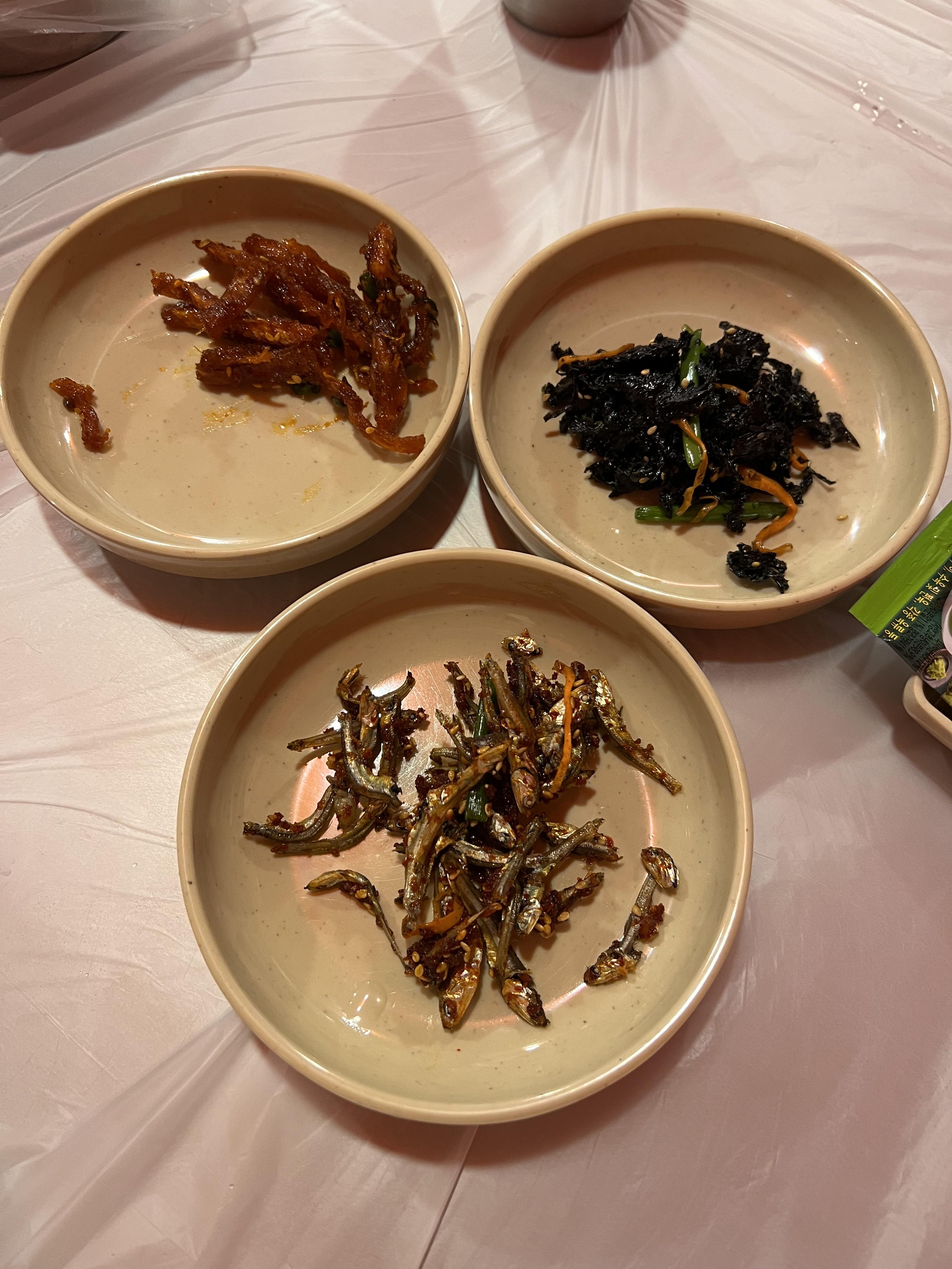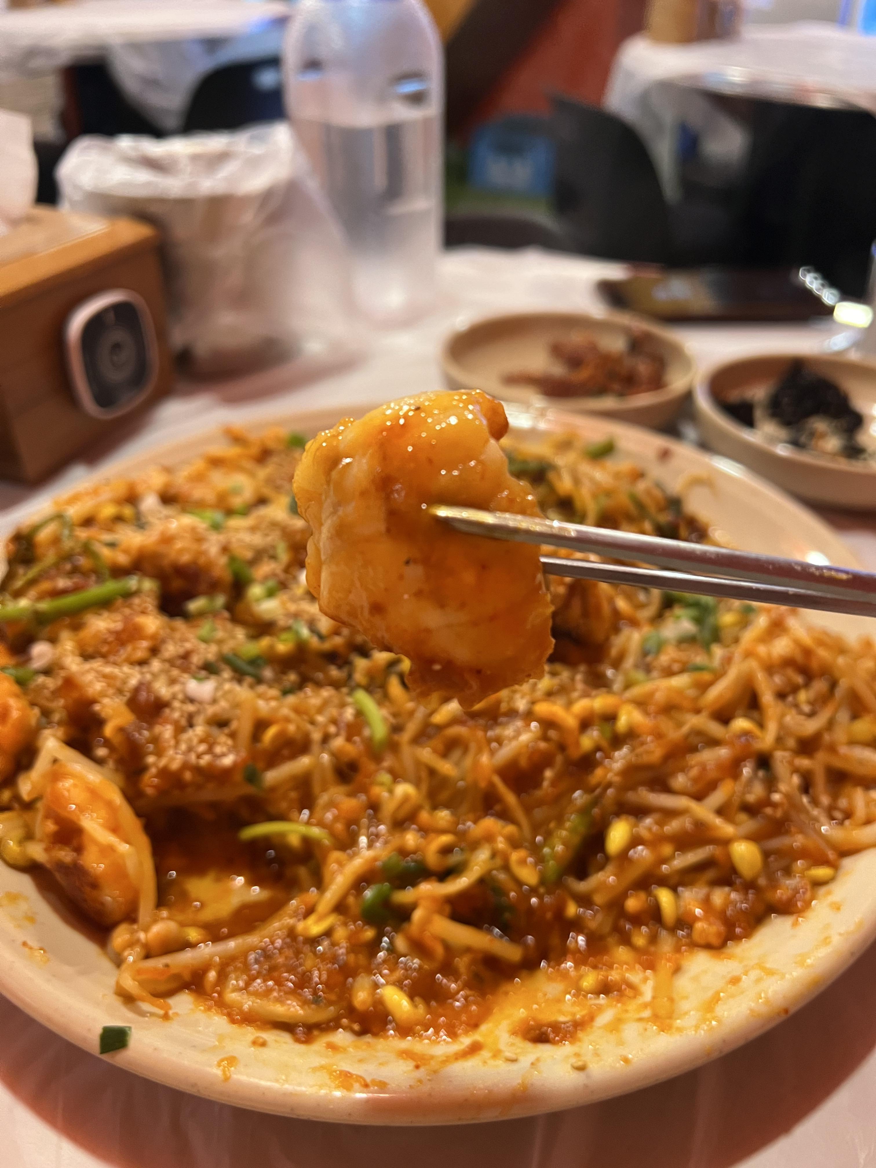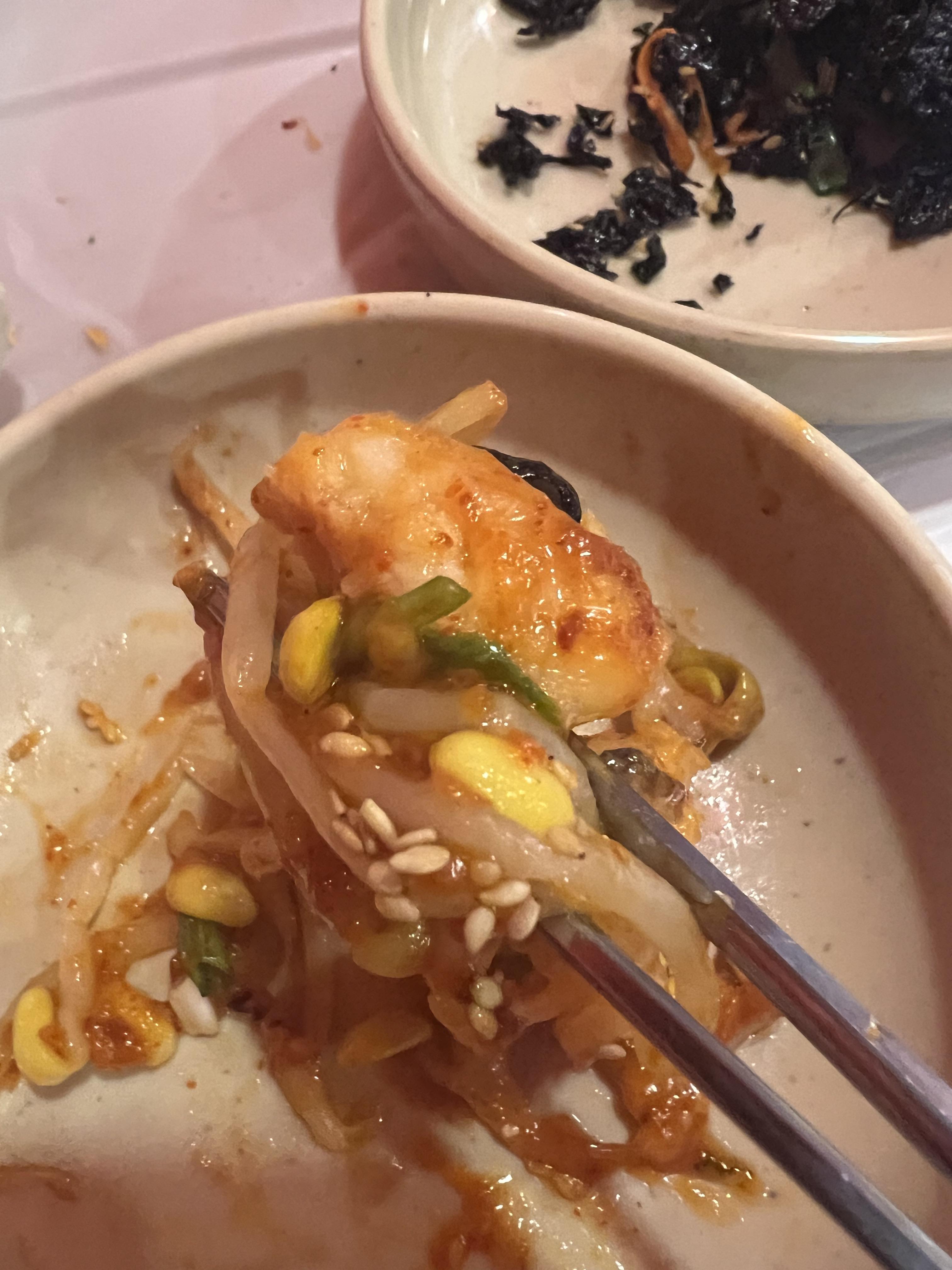 저희는 살로만아구찜(소) 에다가 곤이추가를 했습니다. 기본 밑반찬으로는 자반, 멸치, 쥐포가 나와요. 서비스로 새우튀김을 받았어요. 정말 친절한 서비스에 감동을 하였습니다! 한눈에 봐도 메인메뉴인 아구찜의 양이 정말 많았습니다.