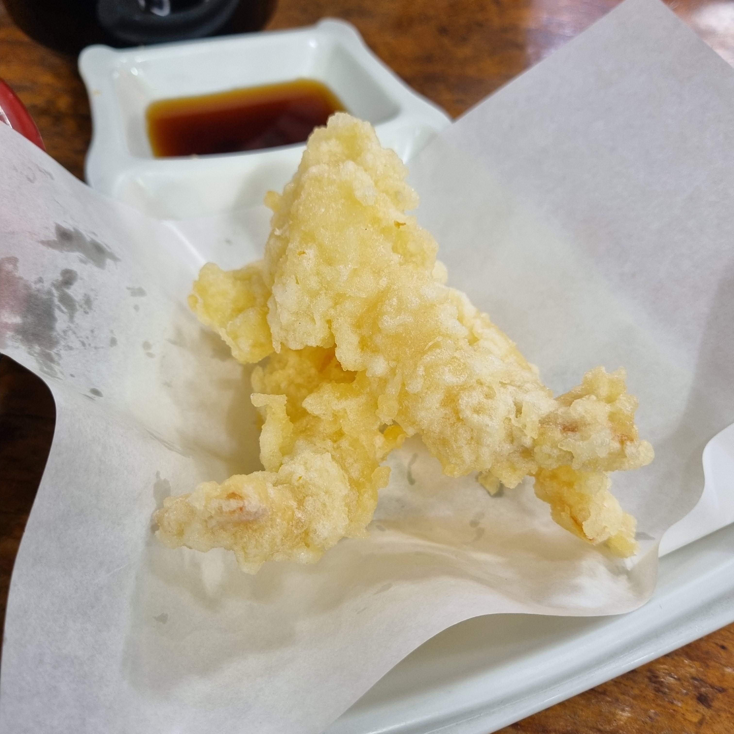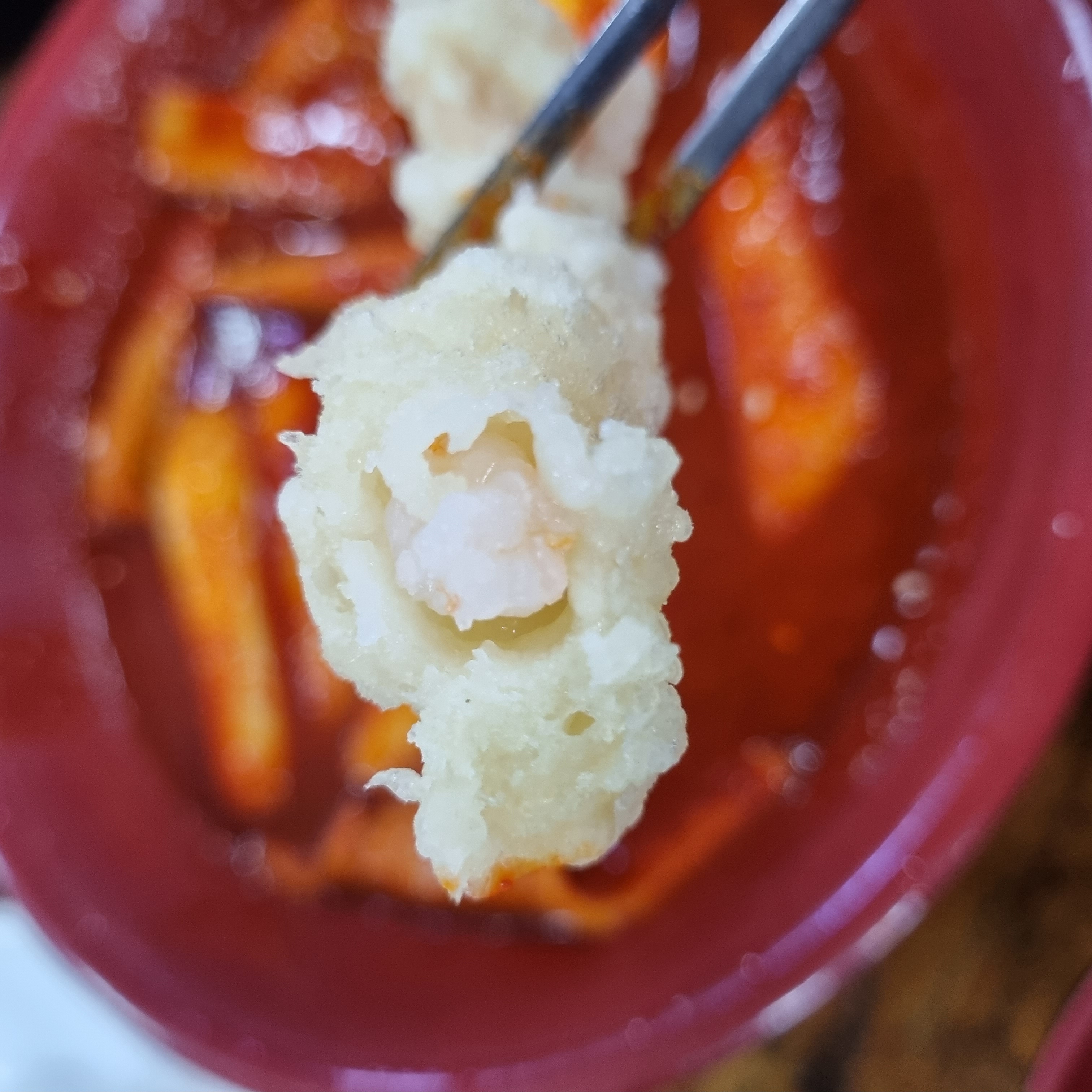 이건 주문서 메뉴에 따로 있었던 새우튀김이에요. 튀김옷이 정말 하얗고 안에 새우도 통통하니 가득 채워져 있어요. 떡볶이 소스에 찍어 먹으면 그야말로 환상의 맛이에요.