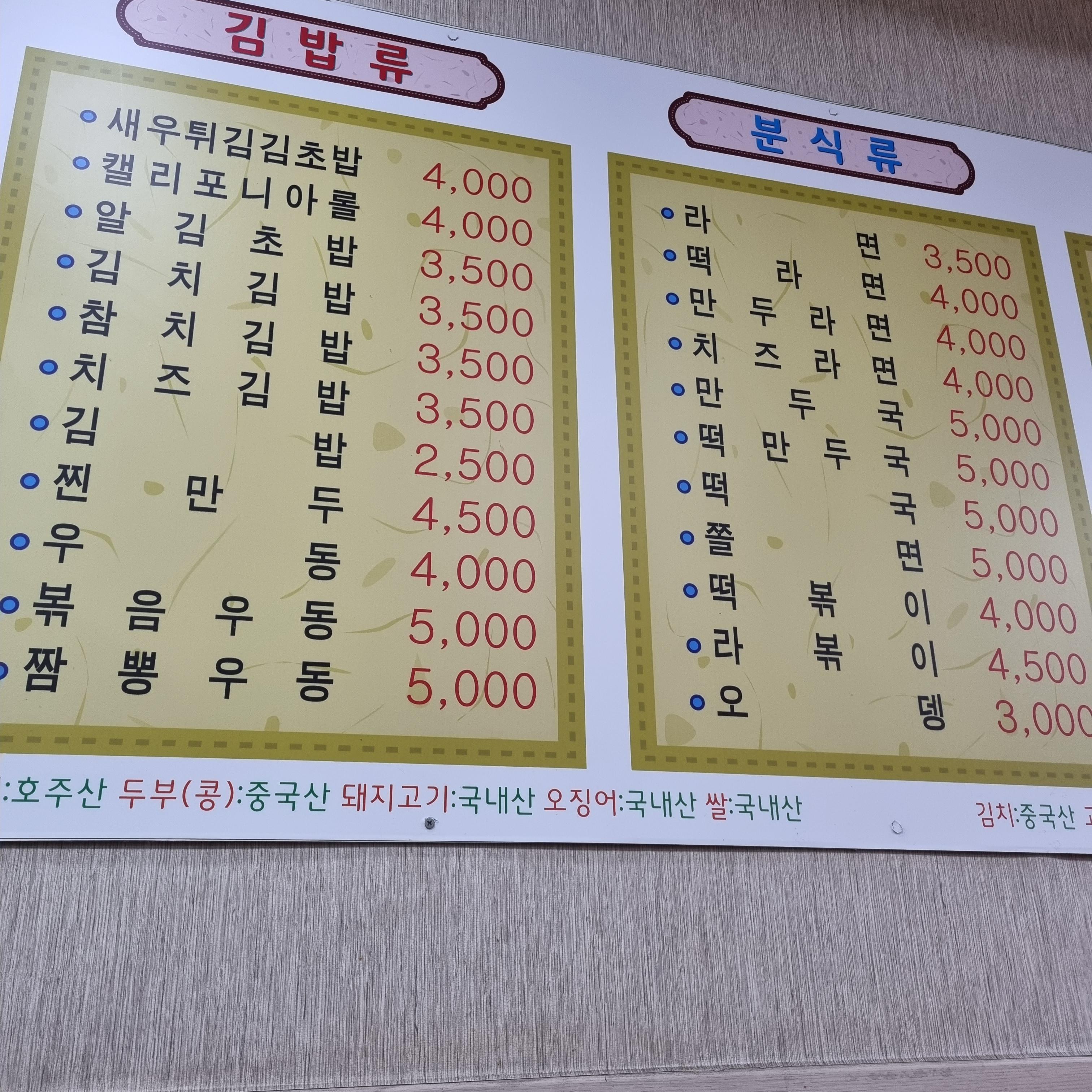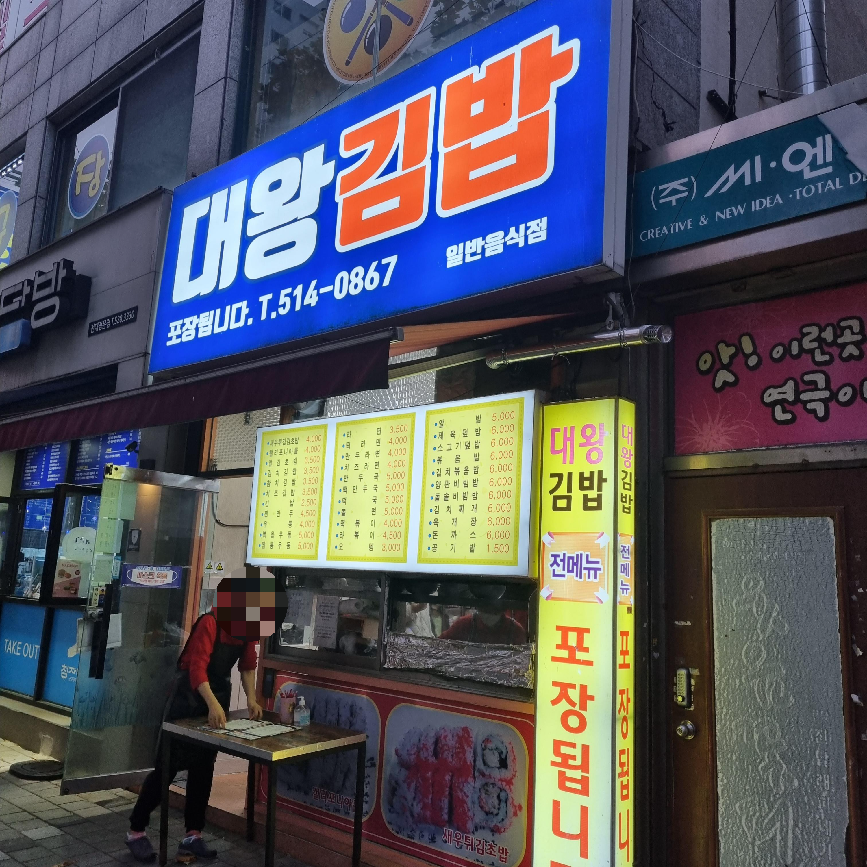 전대정문 맛집 대왕김밥 메뉴판입니다. 김밥류, 분식류, 식사류가 각각 있네요. 대왕김밥의 가장 시그니처 메뉴는 김밥류의 새우튀김김초밥 이에요. 웬만한 여성분들은 특히 이건 무조건 주문하는듯합니다. 혼자 밥 먹으러 오신 남성분들은 역시 돈까스나 제육덮밥을 드시는 분들이 보였습니다. 요즘 시세에 맞지 않게 가격들이 정말 저렴하죠??! 가격도 저렴한데 맛도 좋고 양도 많아서 꾸준한 사랑을 받고 있는 것 같아요!