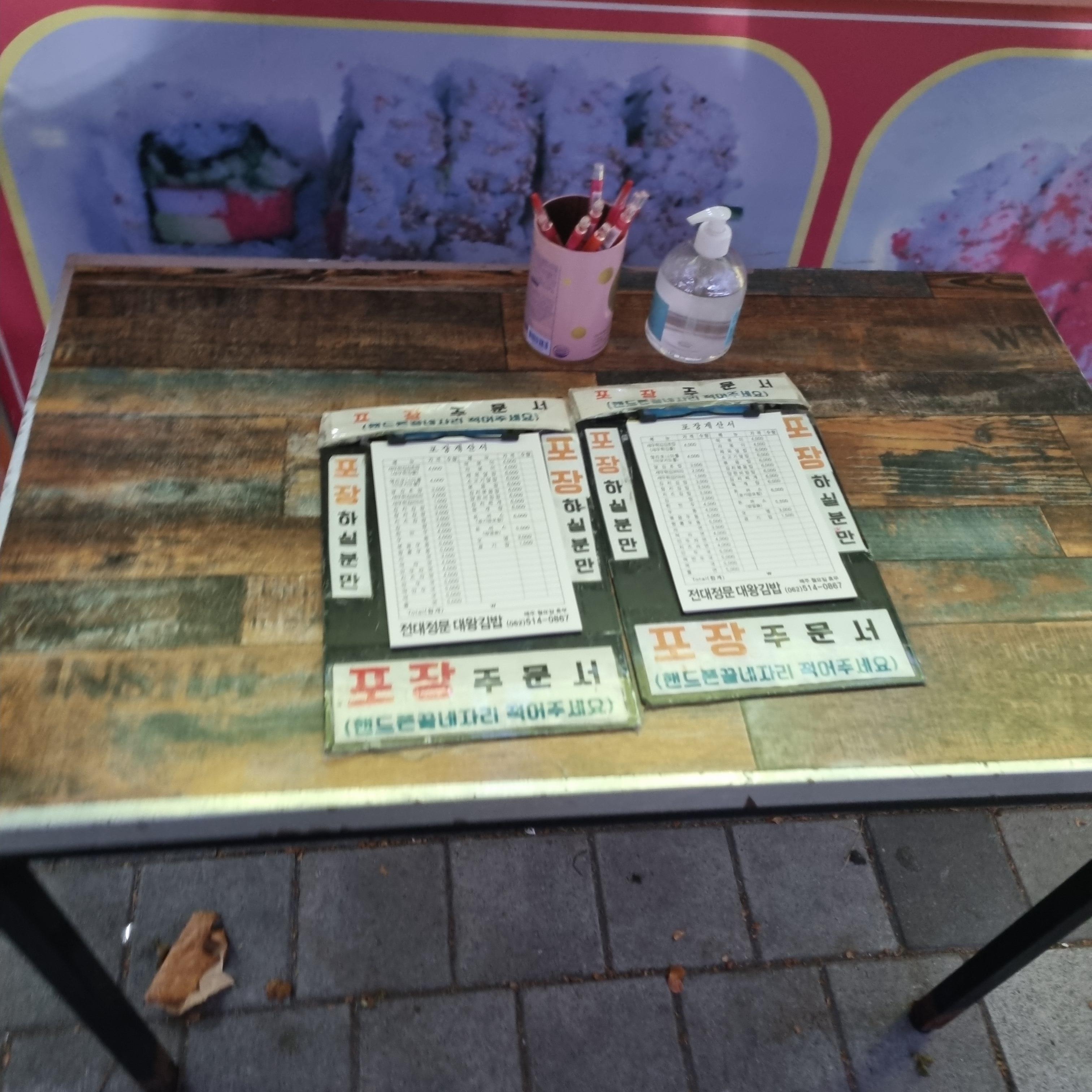 전대정문 맛집 대왕김밥은 평일이든 주말이든 식사 시간대에 가면 웨이팅은 정말 기본으로 생각하고 가셔야 합니다. 저는 이날 식사 시간보다 좀 더 일찍 움직여서 바로 들어갈 수 있었는데요. 주문하고 5분 앉아있었나?? 곧바로 만석으로 차버림...!! 매장 앞에는 포장하는 손님들을 위한 주문서가 따로 마련되어 있습니다.