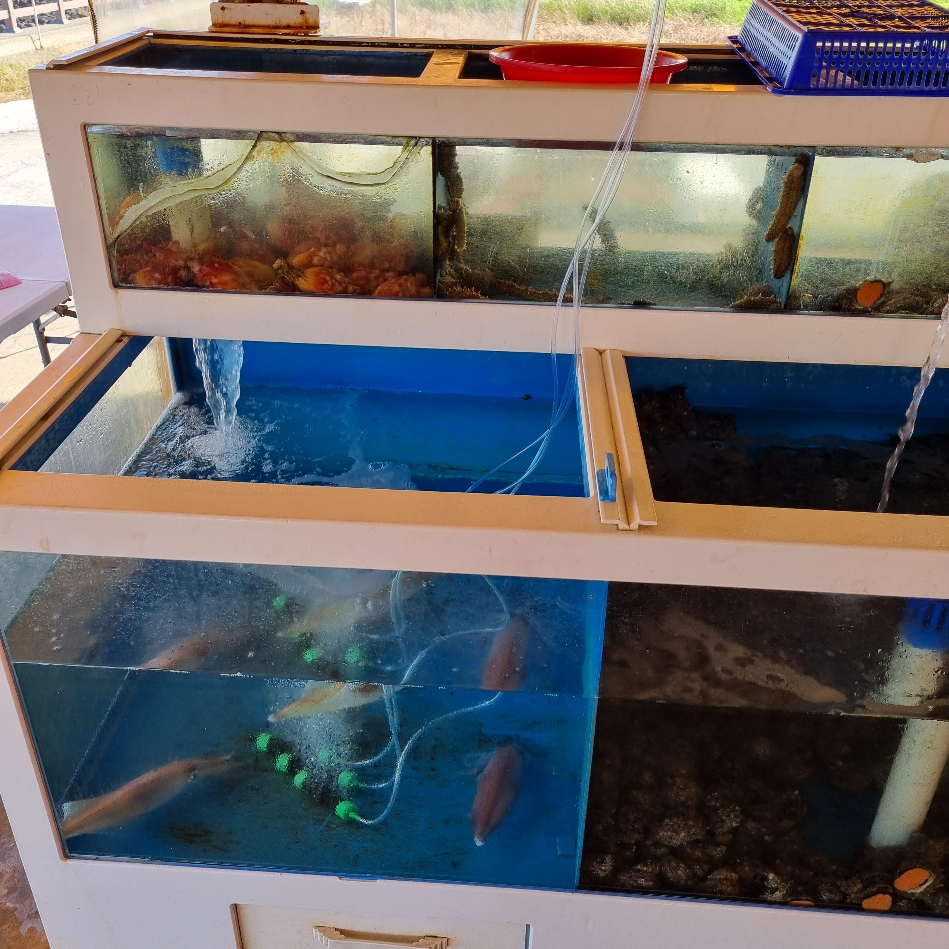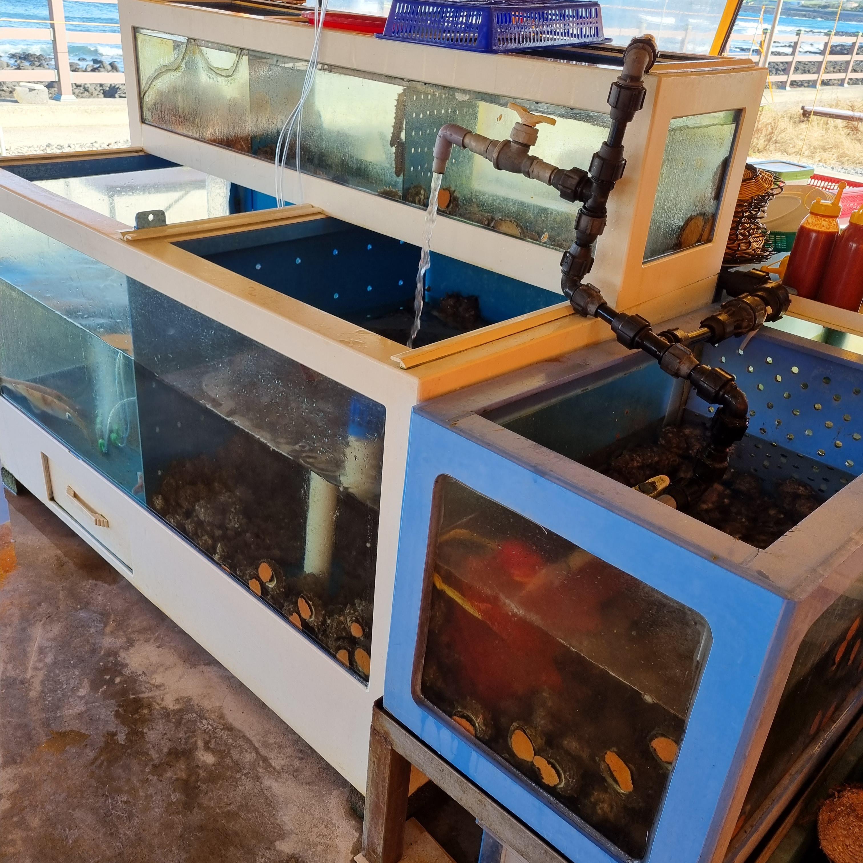 수족관 안에는 싱싱한 오징어, 소라, 전복이 보입니다.