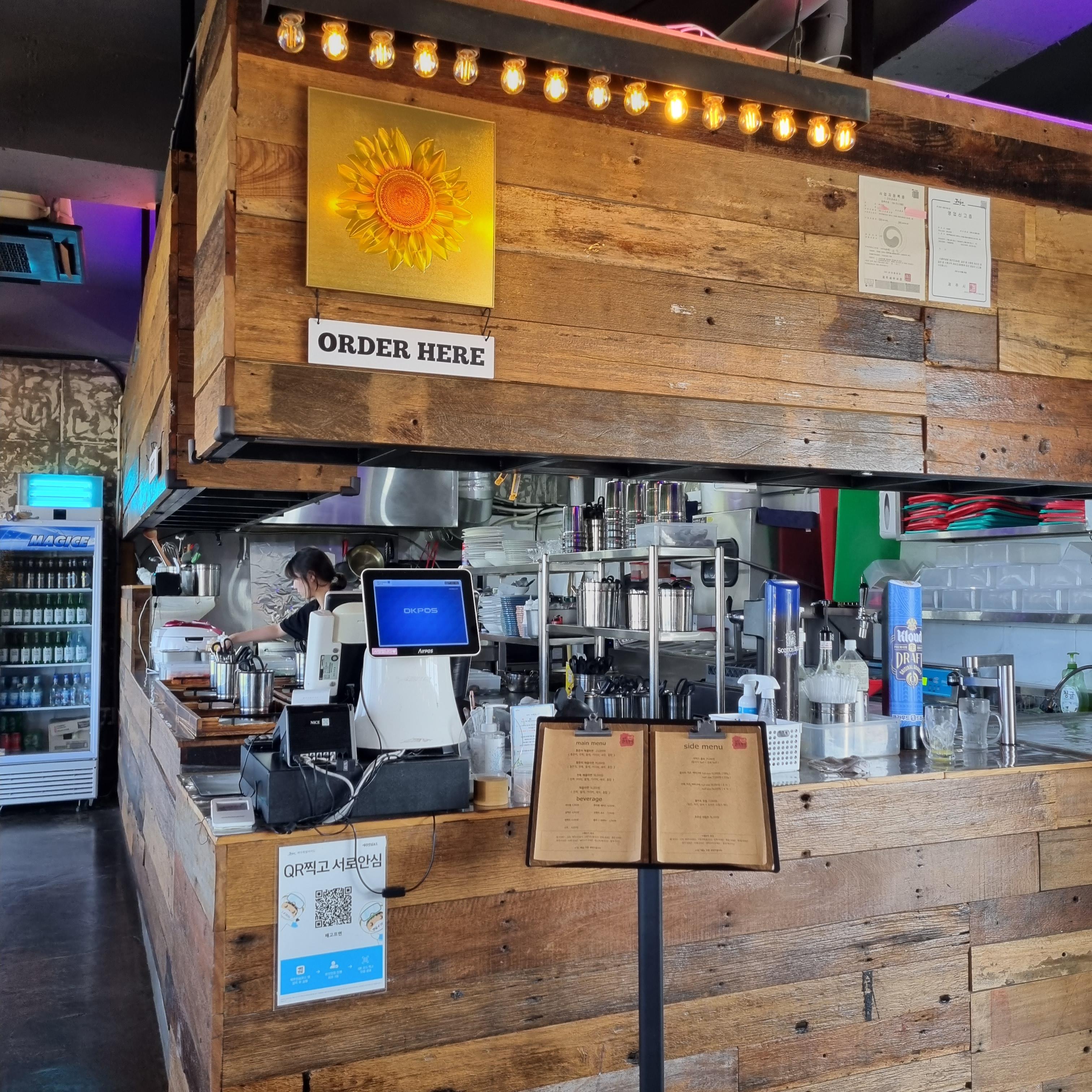 오픈 주방과 카운터가 함께 있네요. 카운터 앞에 있는 메뉴판을 보시고 먼저 선불 결제를 하시는 거예요. 메인 메뉴는 해물라면 베이스로 통문어, 통한치, 전복이 있습니다. 사이드 메뉴로는 랍스터 치즈 버터구이, 전복 치즈 버터구이, 볼카츠 모듬, 코코넛 쉬림프가 있네요. 무엇보다 좋았던건 음료에 하이볼이 있다는거였어요!