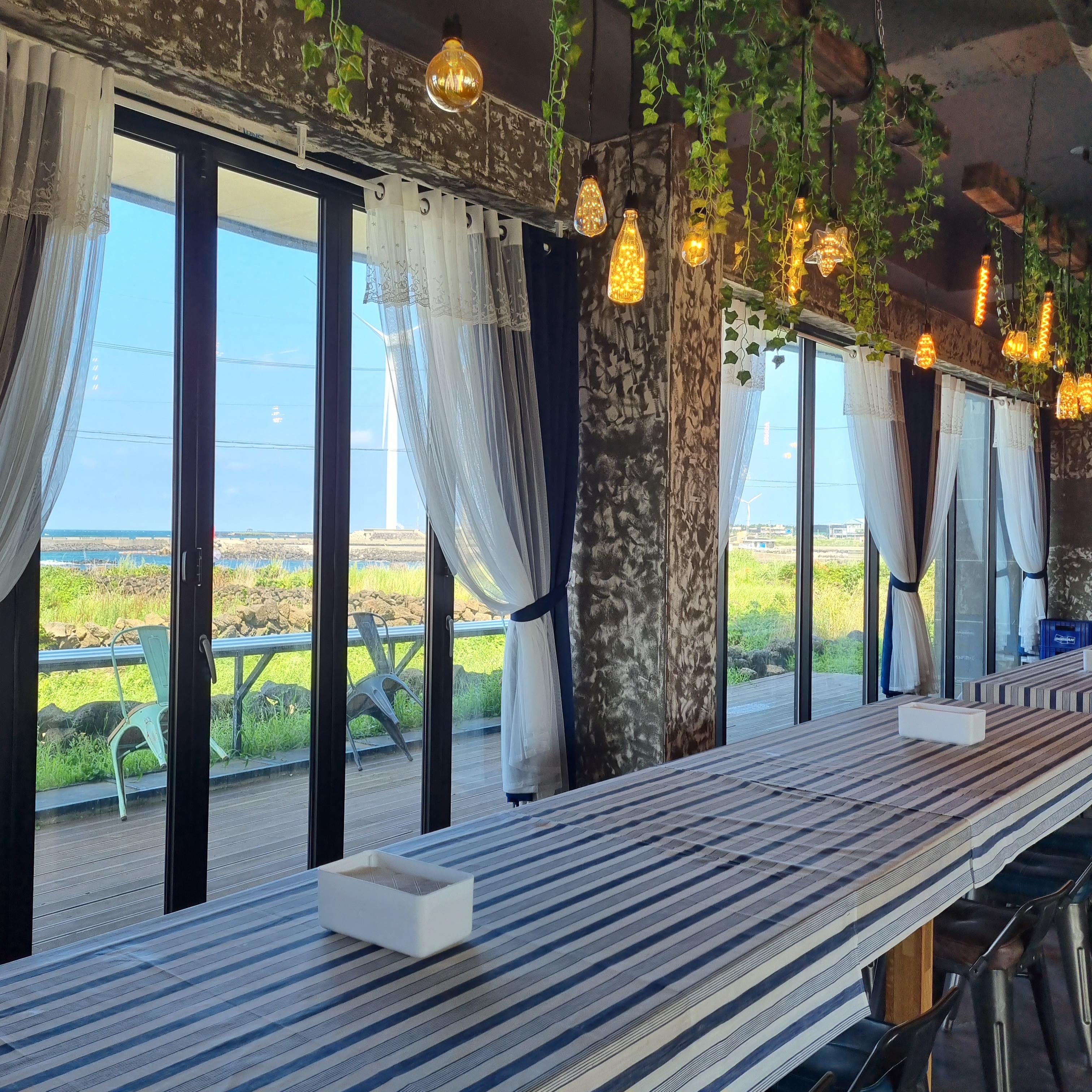 제주 월정리 맛집 추천 배고프면 매장 내부는 힙한 감성으로 느낌있는 분위기였어요. 밖에서 먹을 수 있게 테라스도 있고요. 일반 음식점과는 다르게 일렬로 주르륵 테이블을 이어놔서 바다를 바라보면서 먹을 수 있도록 해놓은 게 너무 좋더라고요!