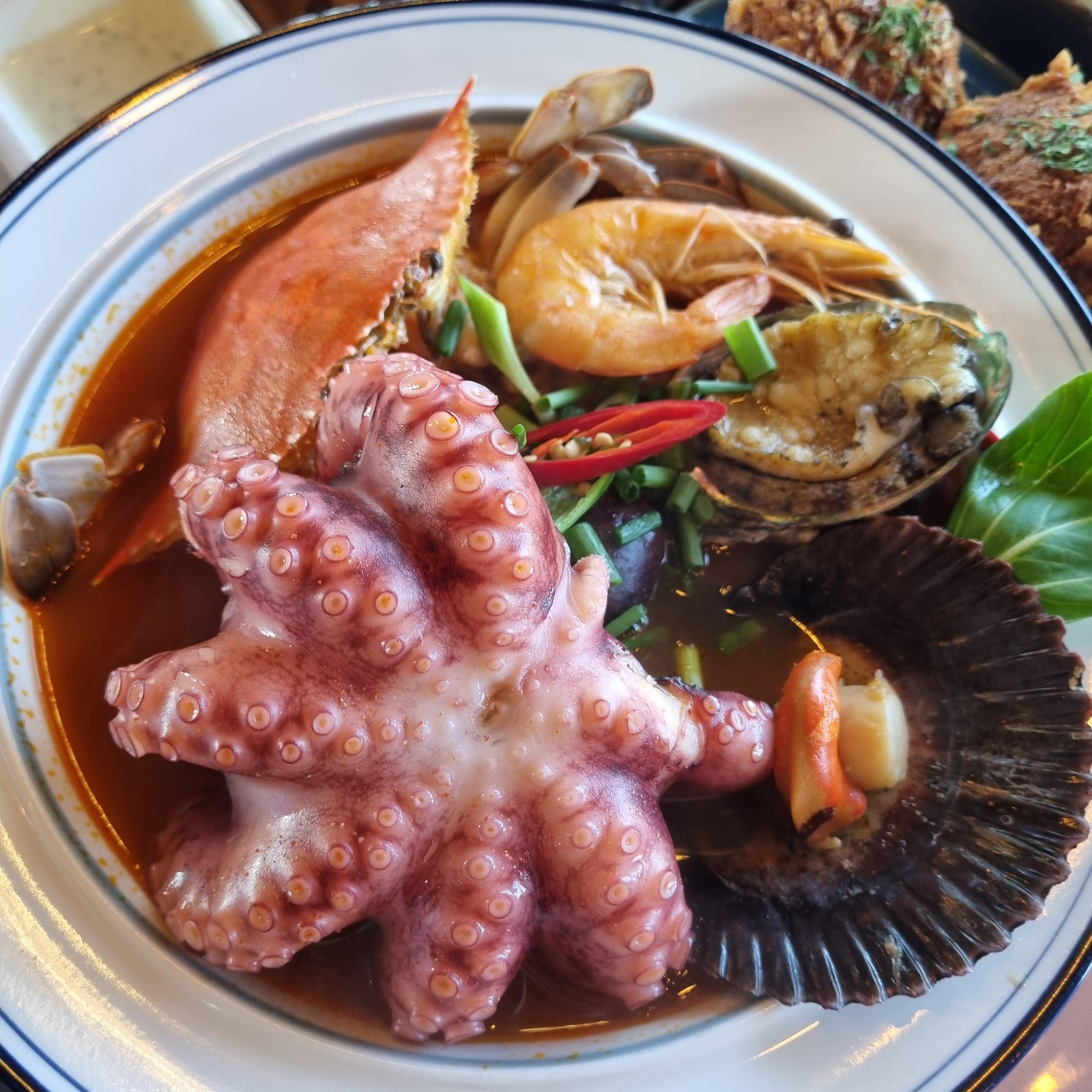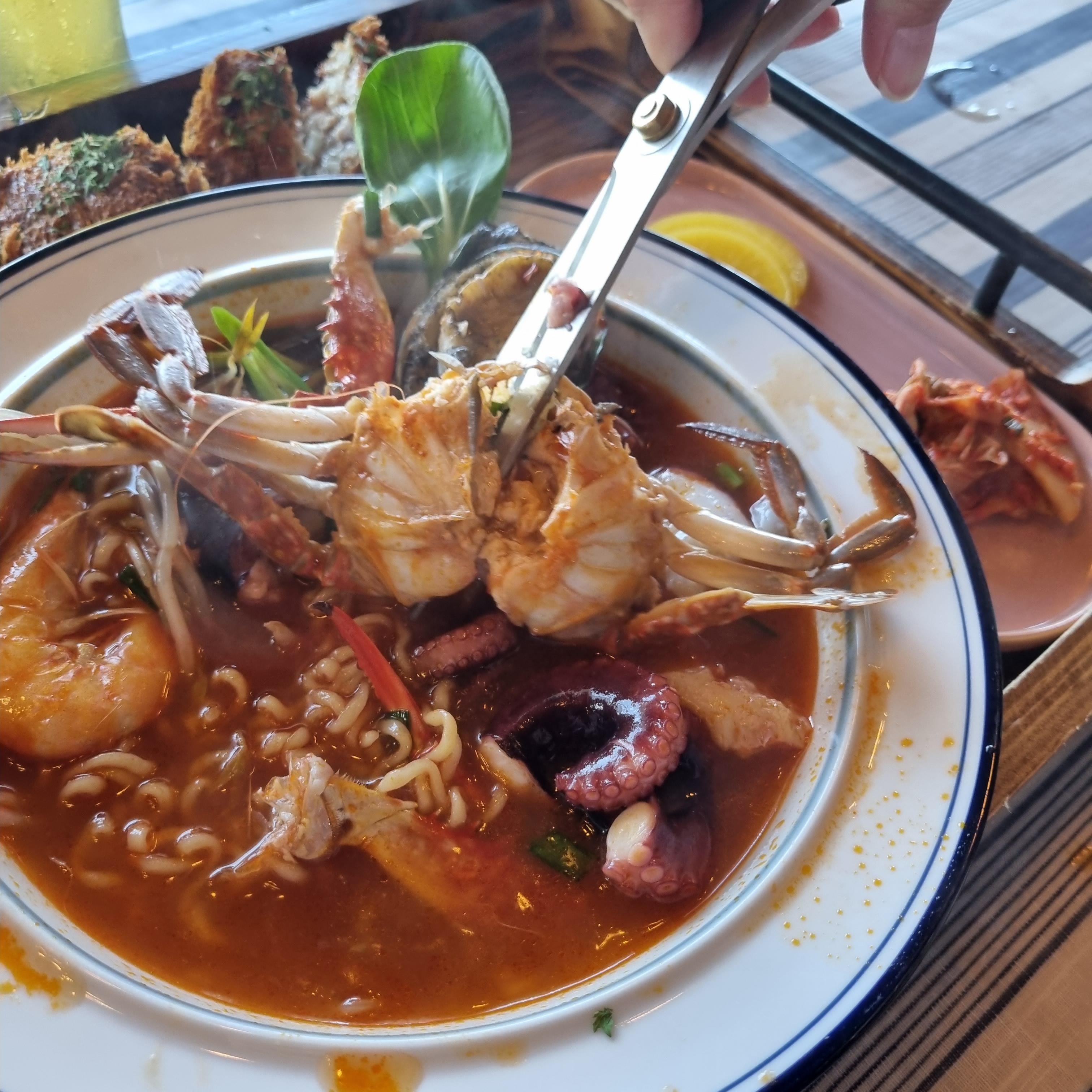 통문어 해물라면과 볼카츠 모듬도 이어서 나왔습니다. 라면 비주얼좀 보세요.. 너무너무 군침돋지 않나요??! 라면안에 해산물을 모조리 아낌없이 때려 넣었습니다. 처음엔 가격이 비싸다고만 느꼈지만 많은 양의 해산물과 맛을 생각하니 전혀 아깝지가 않았어요. 일반 라면이라고 생각하시면 오산이에요. 육수가 진짜 미쳤어요.. 일반 라면 스프맛이 아니라 직접 만들어서 해산물을 넣으니 이곳에서만 맛볼수있는 맛이에요! 면빨도 정말 좋고 해산물들 비린내 하나도 안나구요 싱싱한 상태로만 나왔어요. 무엇보다 다들 사이즈도 크고 도톰해서 너무 좋았어요.