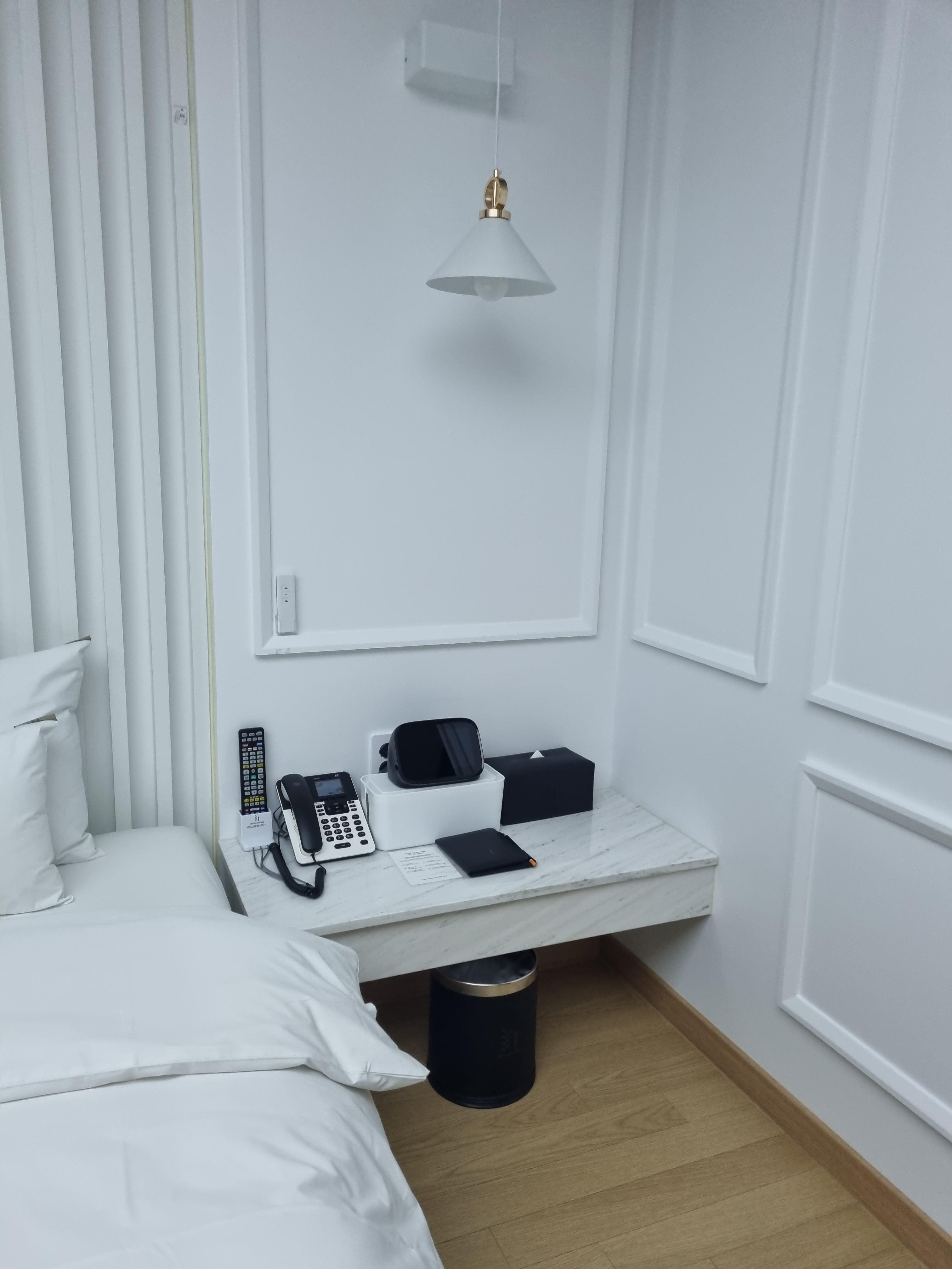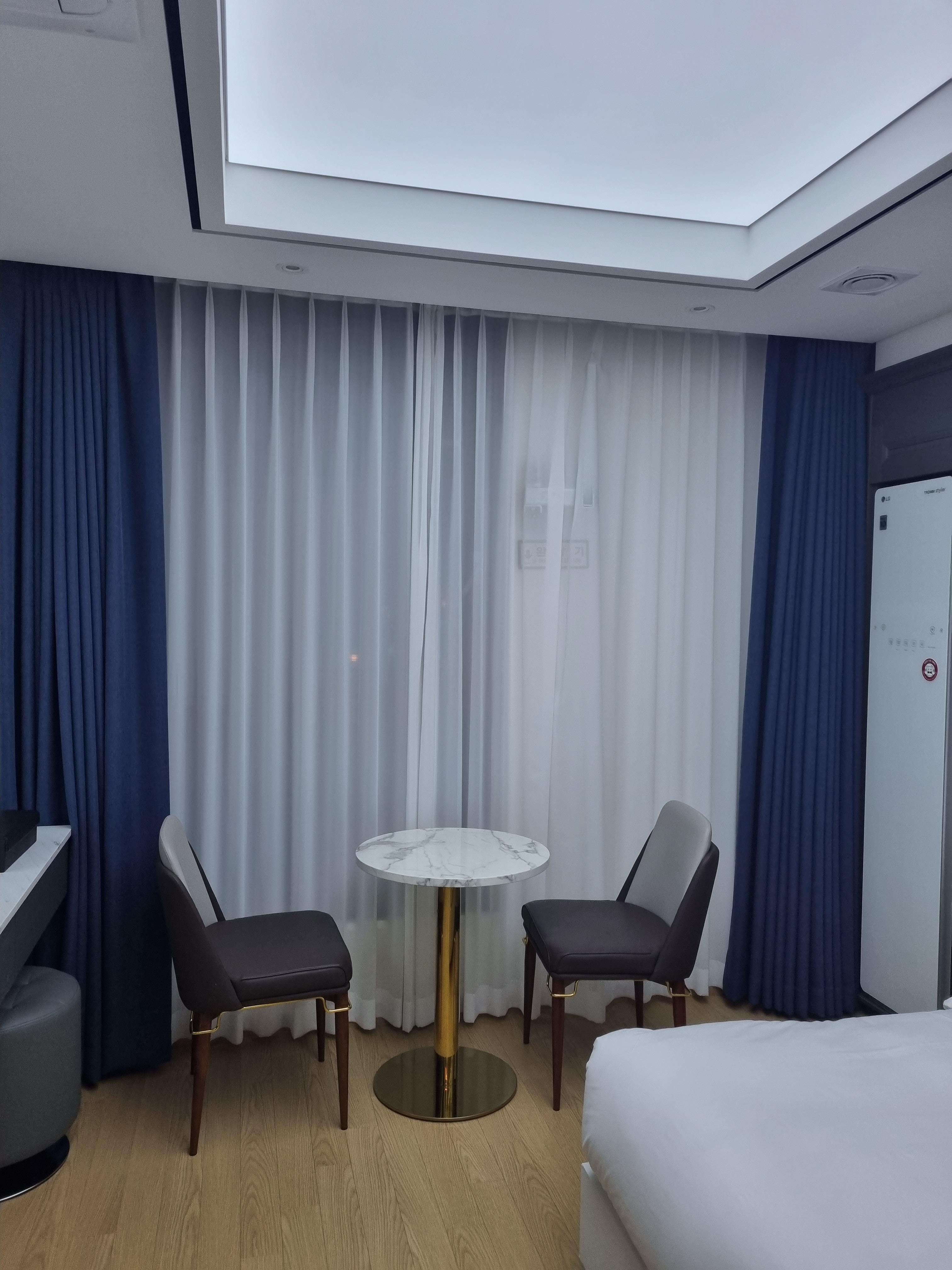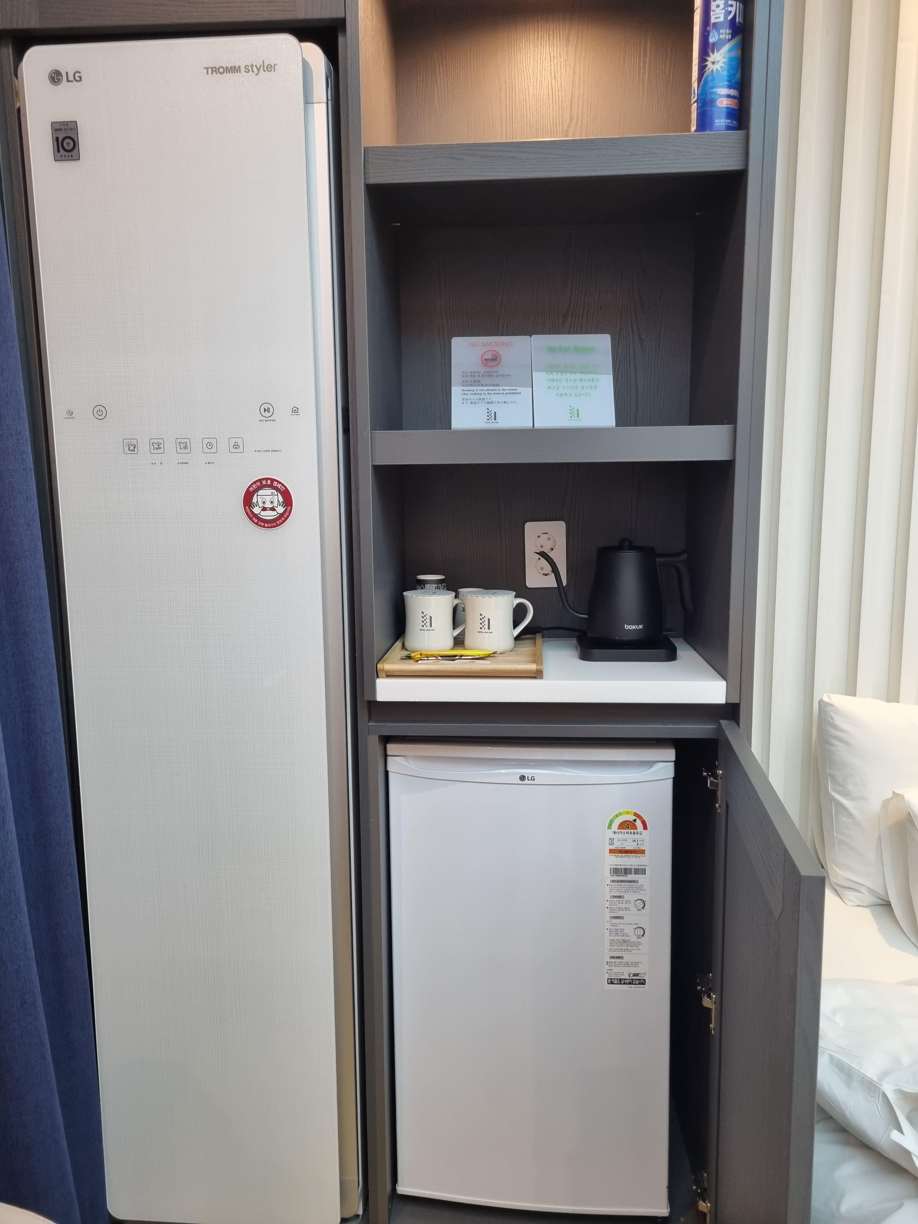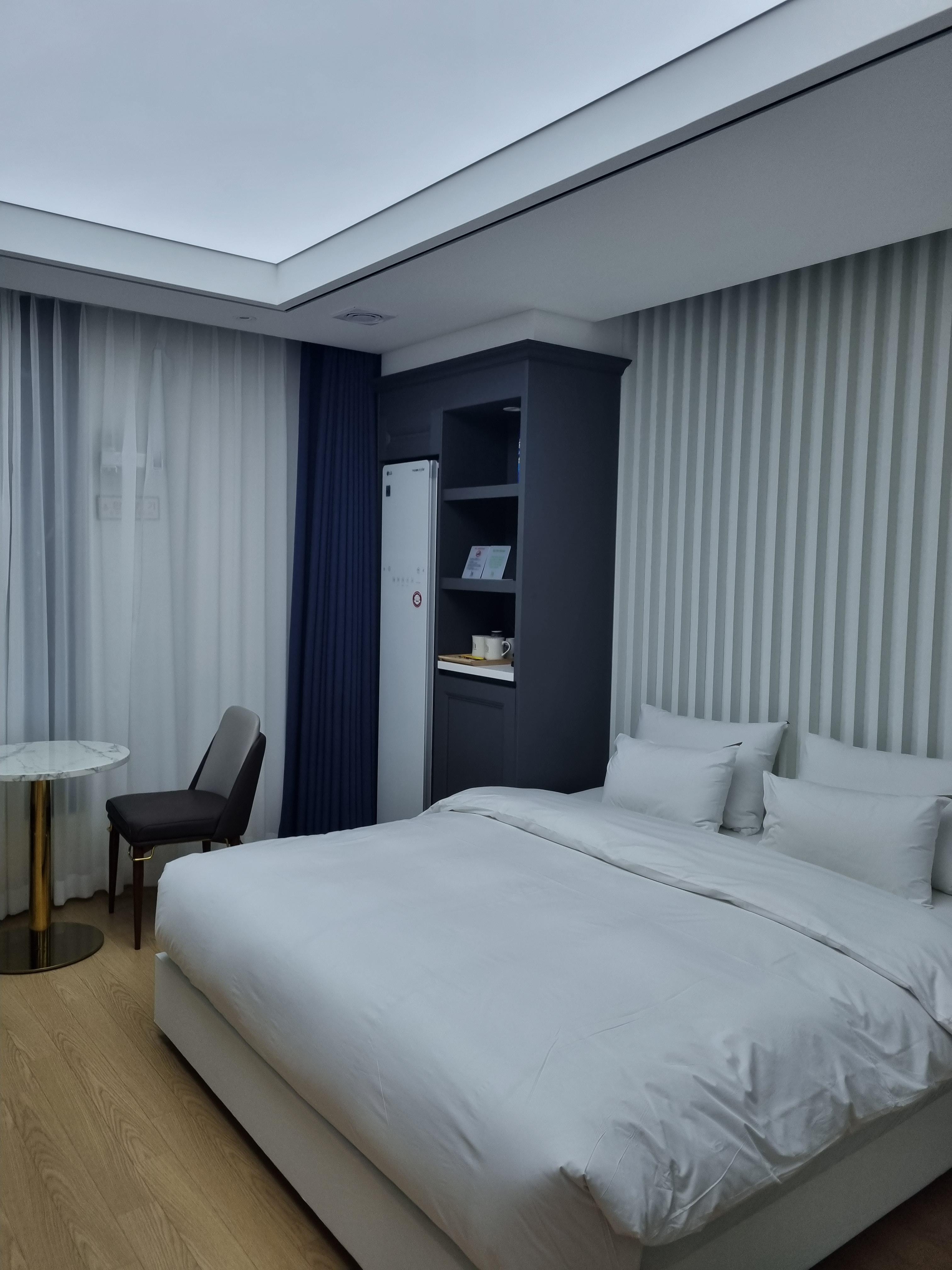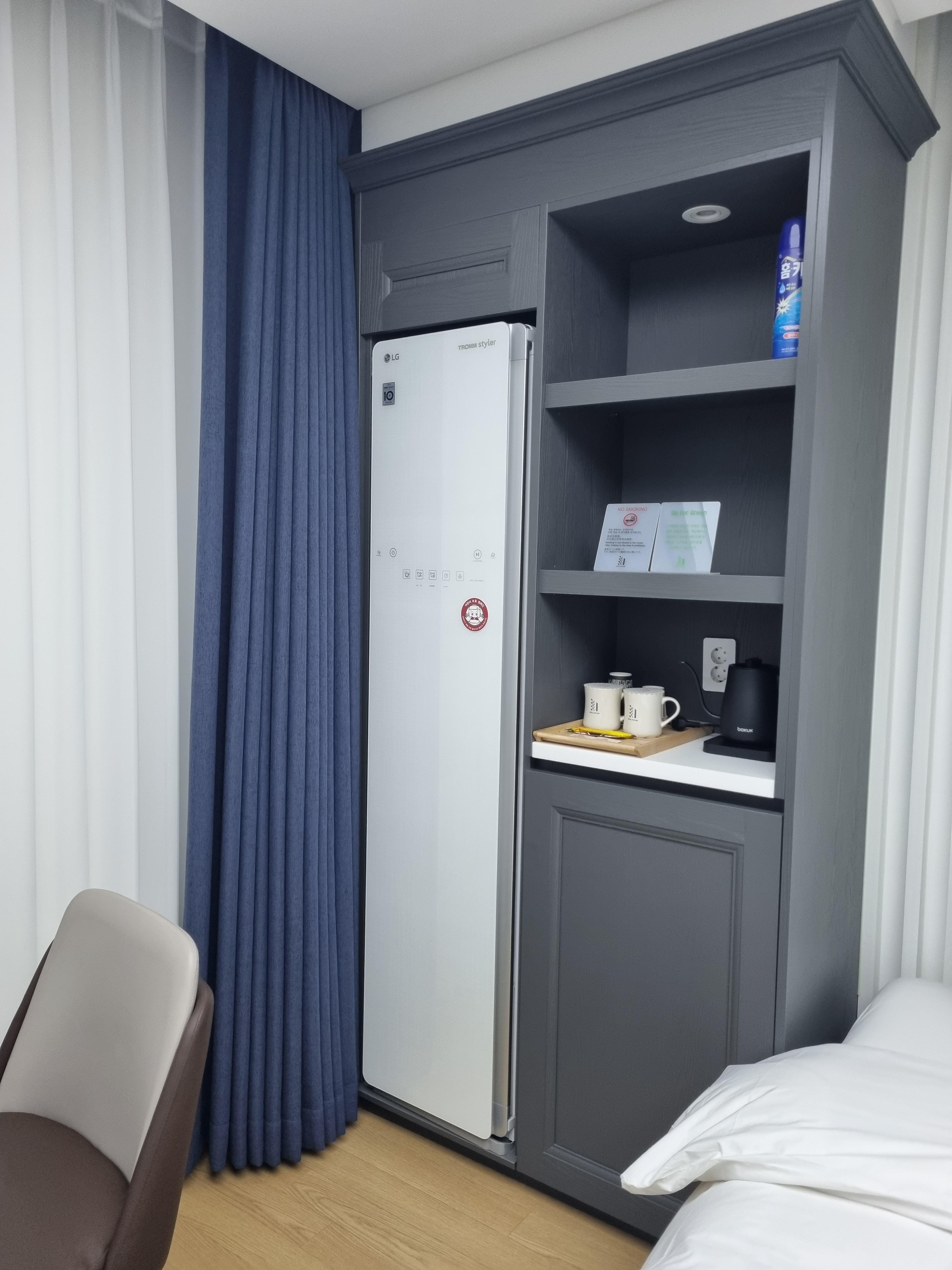 첨단 호텔 추천 객실에 기가지니가 있어서 "하이,지니"라고 부르면 지니가 응답을 해서 대화를 할 수 있습니다. 지니에게 무엇을 부탁해보세요. 창문에 있는 커튼은 반자동이에요! 정말 놀랐는데요. 손으로 딱 만졌더니 쭉 열리고 닫히고 그러더라고요. 침대 옆에 전화기 쪽에 커튼 리모컨도 있으니 사용하셔도 됩니다. 한쪽에 스타일러도 있어서 놀고 들어와서 스타일러 한번 돌려주시고요. 커피포트 아래에 문이 있는데 문을 열면 냉장고가 숨어있습니다. 냉장고 안에는 생수 3병이 제공되더라고요.