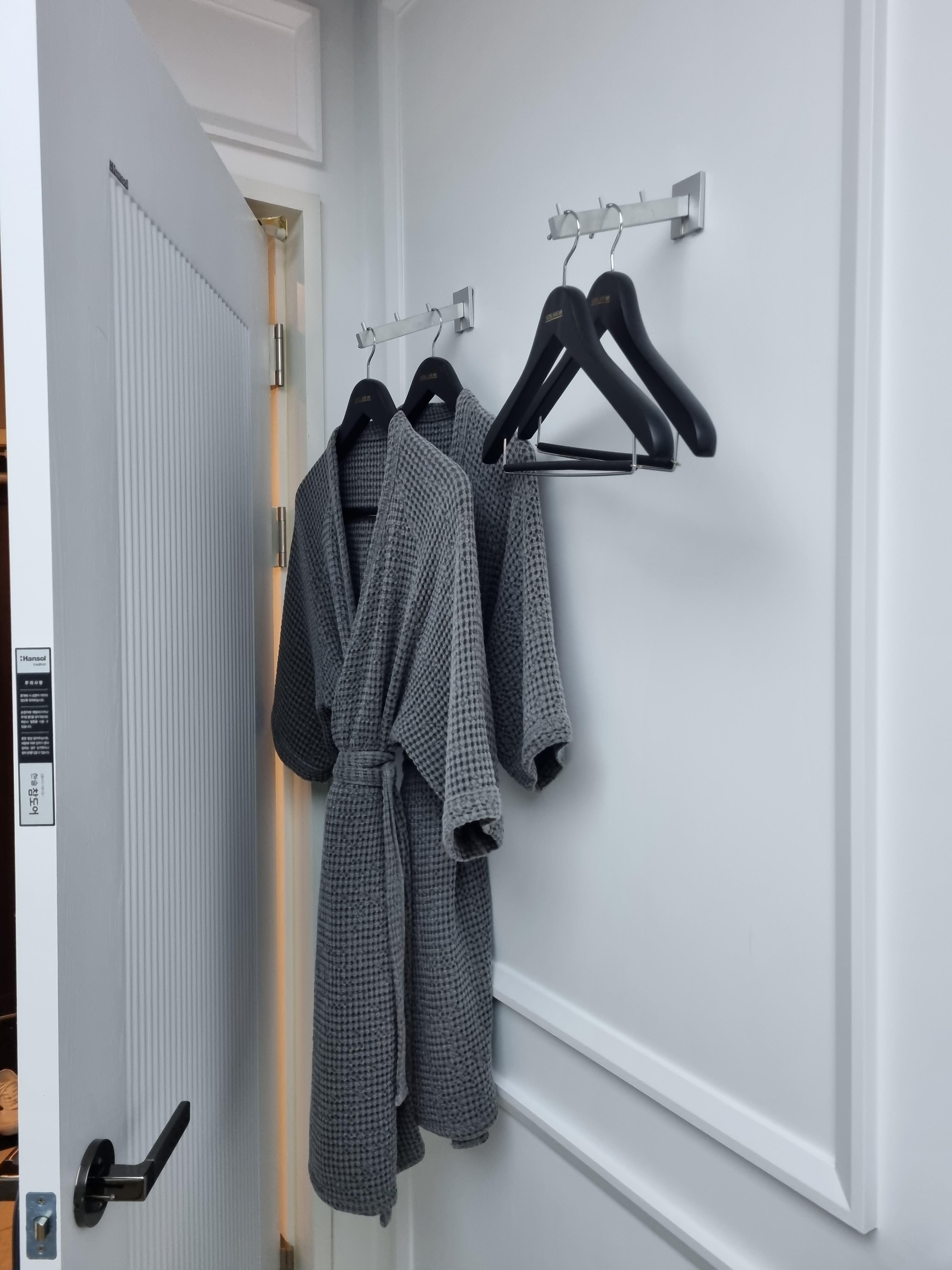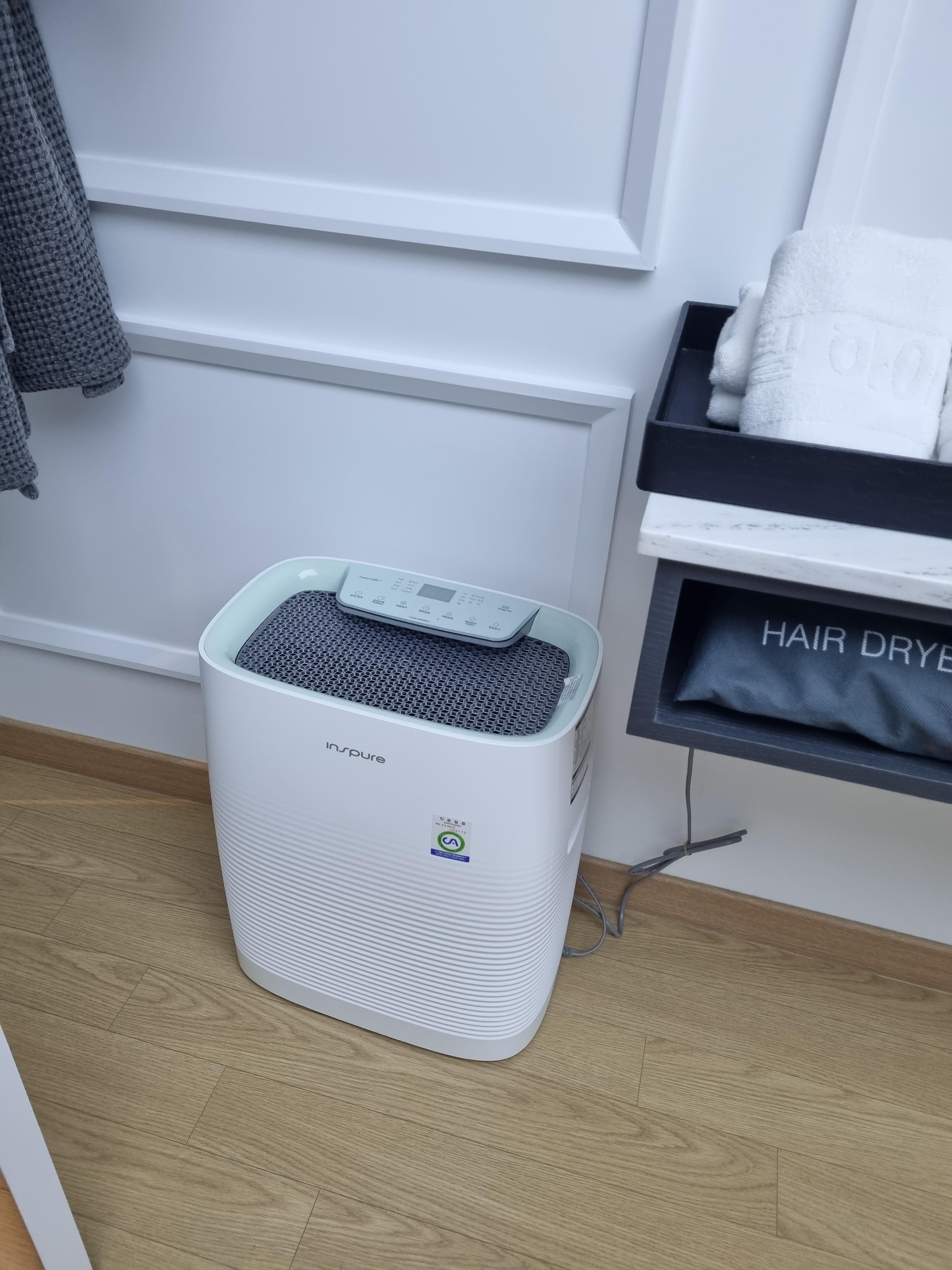 가운도 있고요. 공기청정기까지 있습니다. 작동시켜봤는데 완전 상태 좋은 거의 새것이었어요. 거북한 냄새 하나도 안 나고 정말 쾌적하더라고요. 아! 참고로 침대에는 따로 전기장판이 없습니다. 호텔들은 원래 전기장판 없는 거 아시죠??! 추운 날씨에도 방안을 엄청 따뜻하게 보일러를 가동해 주셔서 바닥이 너무 따뜻해요. 잘 때 하나도 안 추웠습니다!