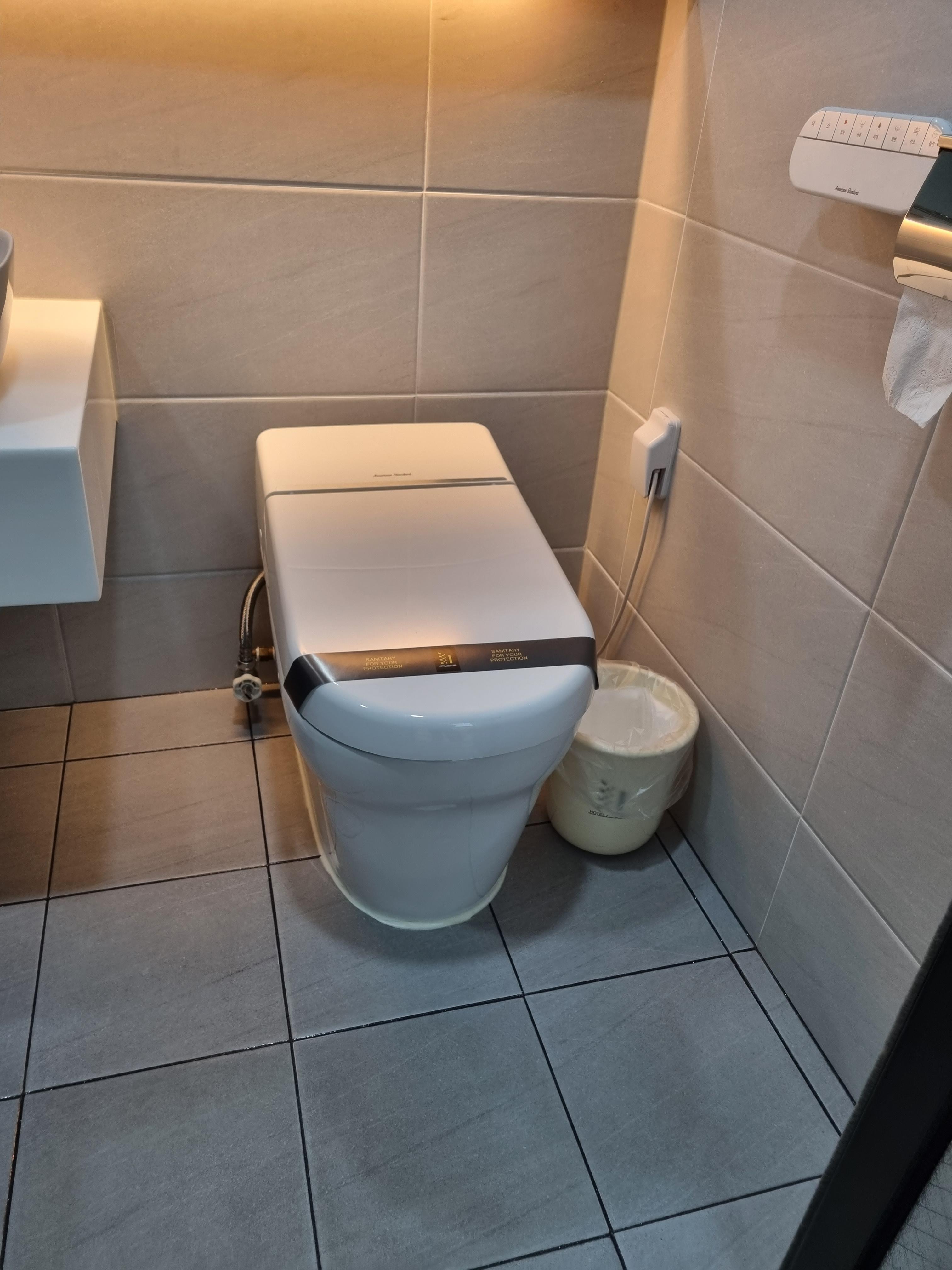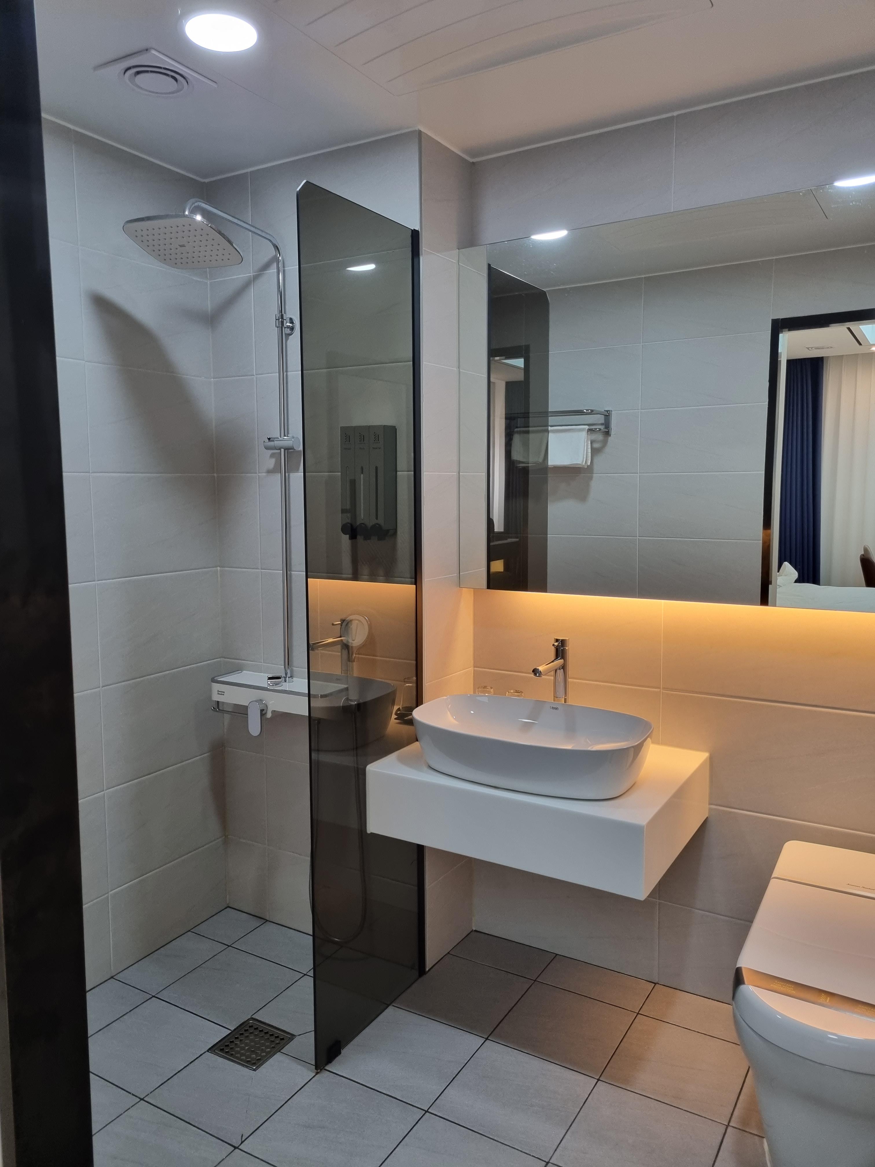 화장실도 정말 넓어서 좋았습니다. 샤워부스와 세면대가 나뉘어 있고 바로 옆으로 좌변기가 있어요. 무엇보다 비데를 찾으시는 분들에겐 좋은 소식이 아닐까 합니다! 앉았다가 일어나면 자동으로 물이 내려가더라고요.
