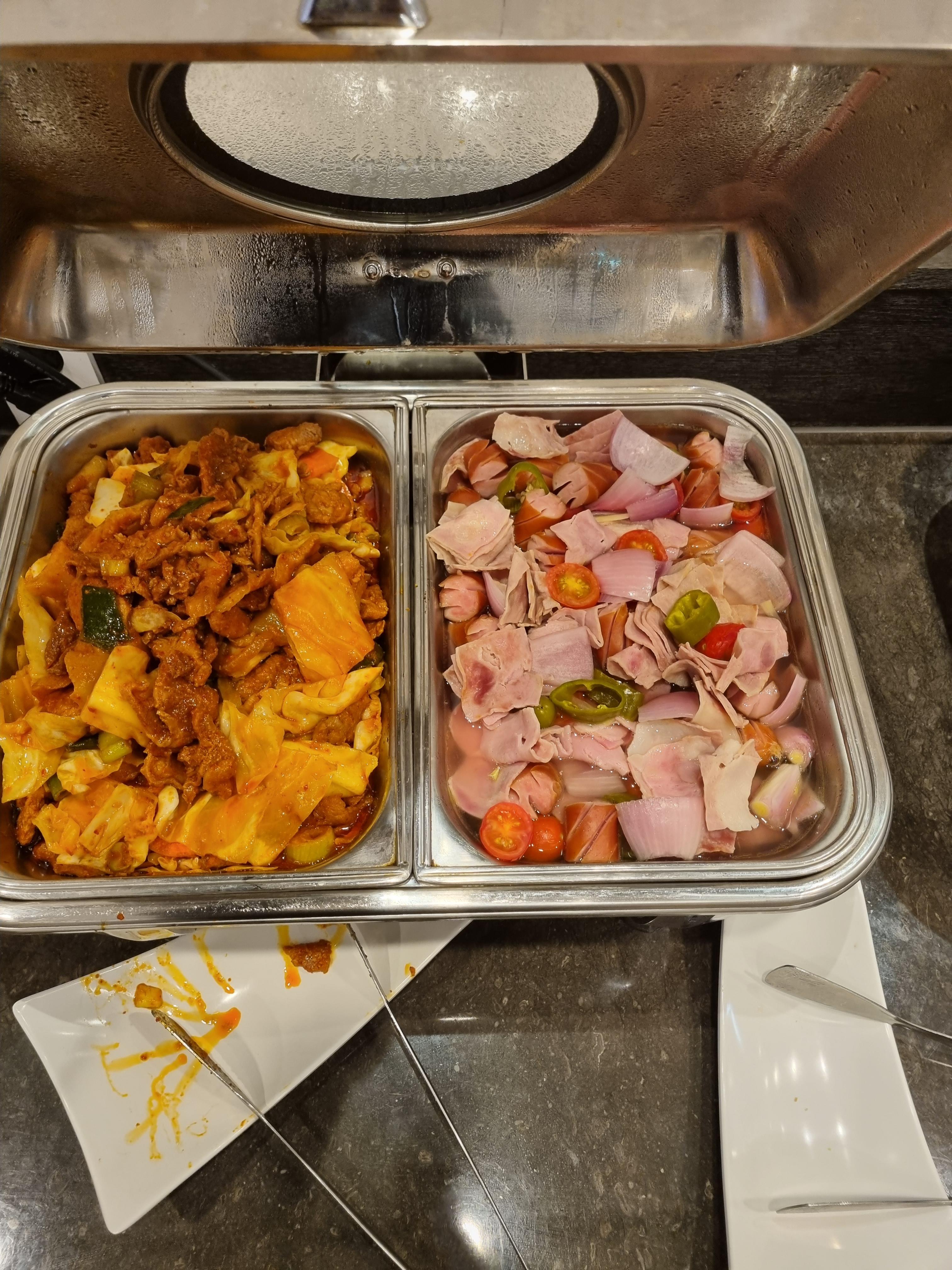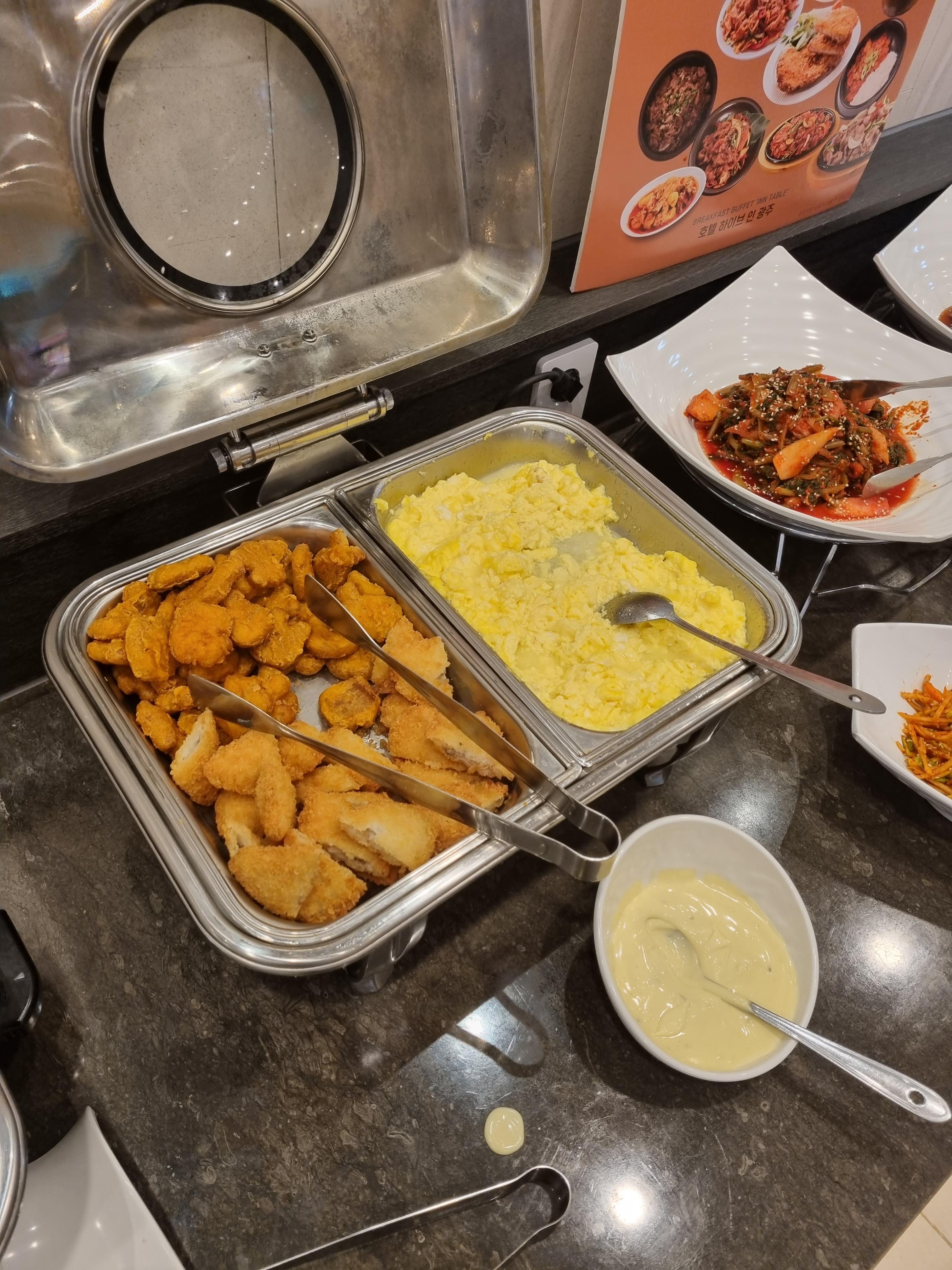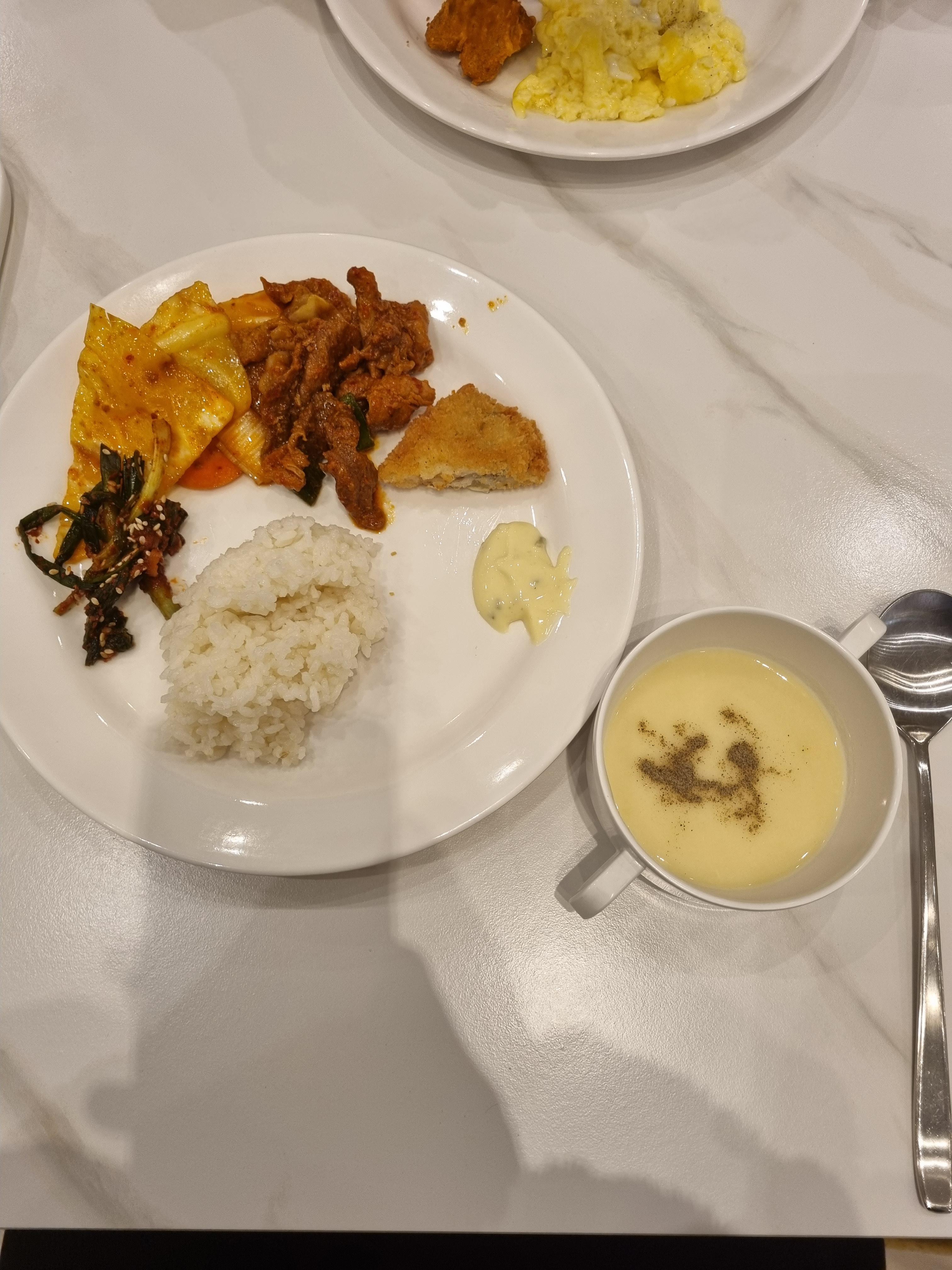 이곳으로 온 목적도 사실 조식이 그렇게 잘 나온다고 해서 조사하고 온 것인데요. 정말 잘 나와서 놀랐어요! 한식 코너에 밑반찬들이 없는 게 없었고 생선가스와 치킨텐더같이 생긴 건 치킨이 아니고 갈비였습니다. 떡갈비 같은 거요! 스크램블을 어찌나 부드럽던지... 인기가 정말 많았어요. 제육이랑 베이컨 소지자까지! 내가 좋아하는 건 다 있어서 정말 좋았어요.