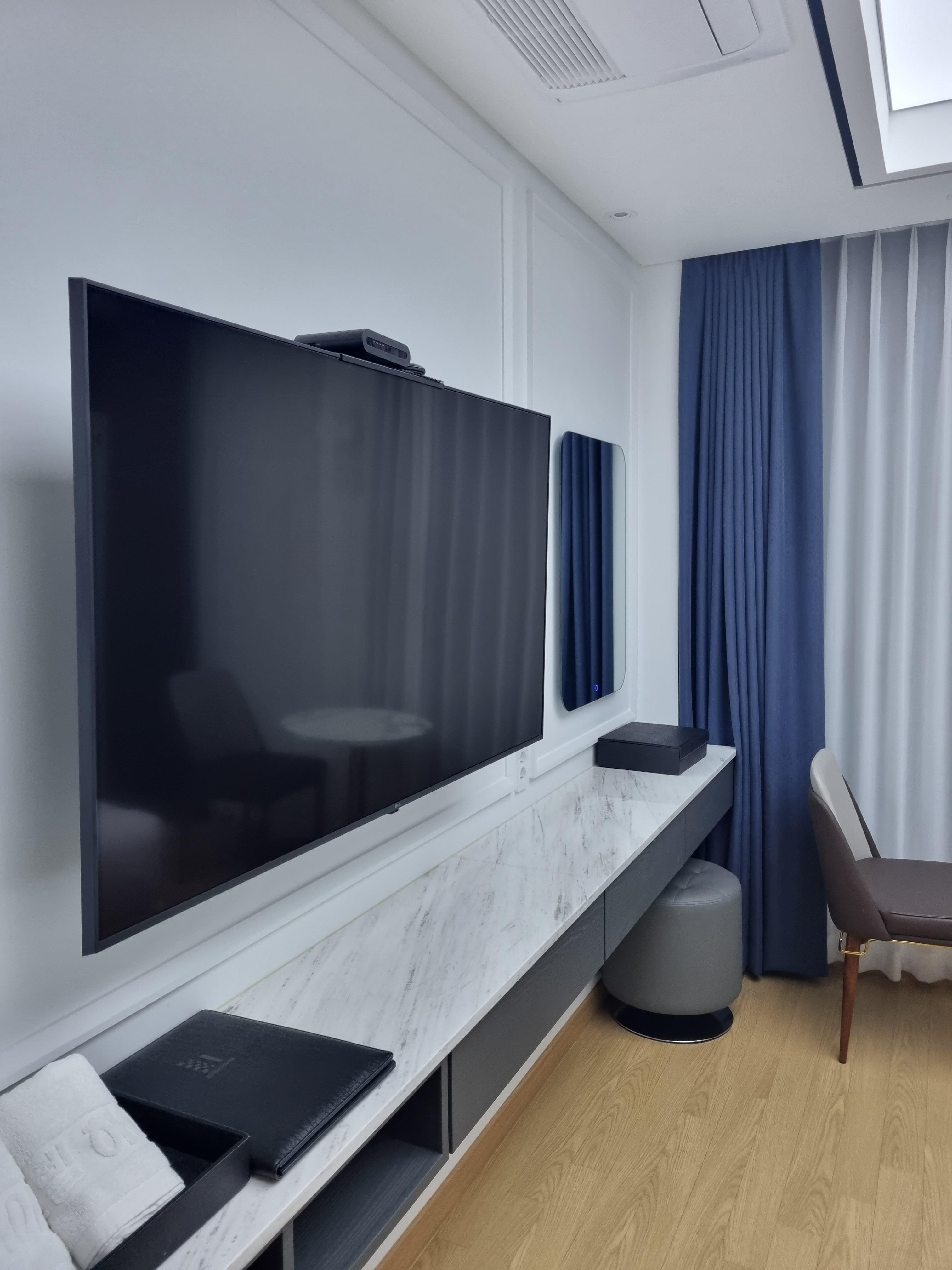 객실을 들어서니 바로 중문이 있어서 요즘같이 추운 날에 특히 찬 바람을 막아주니 좋고 방음에도 좋아요. 있어 보니깐 방음 걱정은 하나도 안 하셔도 됩니다. 다른 객실 소리 하나도 안 들렸어요! 침대 관리가 상당히 잘되어있고요. 청소 상태는 최고였습니다. 티비도 정말 커서 넷플릭스 보기에도 정말 좋았어요. 밖에서 놀고 들어와서 영화 봤는데 너무 즐거웠어요.