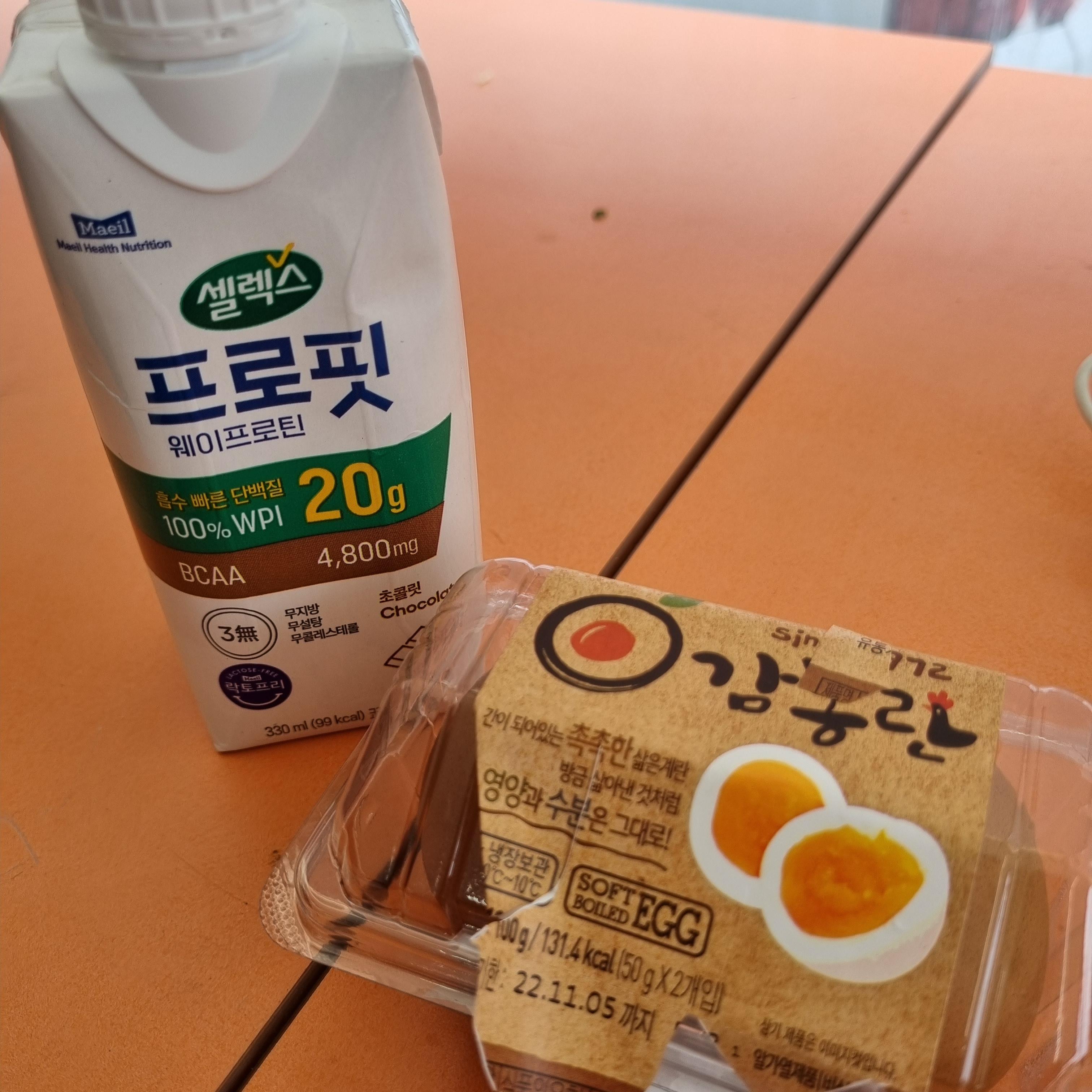 개인적으로 급할 때 간단히 배속만 채우기 좋은 음식이 있다면! 편의점 감동란 강력히 추천해드립니다. 너무 촉촉해서 먹기도 좋고 맛도 살짝 짭짤해서 다른 삶은 계란보다 훨씬 맛있더라고요. 한 번씩 사서 먹긴 하지만 사실 이날은 감동란 먹고 마실 게 필요해서 때마침 눈에 편의점 단백질 쉐이크 프로핏이 눈에 들어와서 순간적으로 충동구매를 하게 되었습니다. 물론 단백질 함량으로 눈이 바로 가서 확인하고 집어 들었습니다.