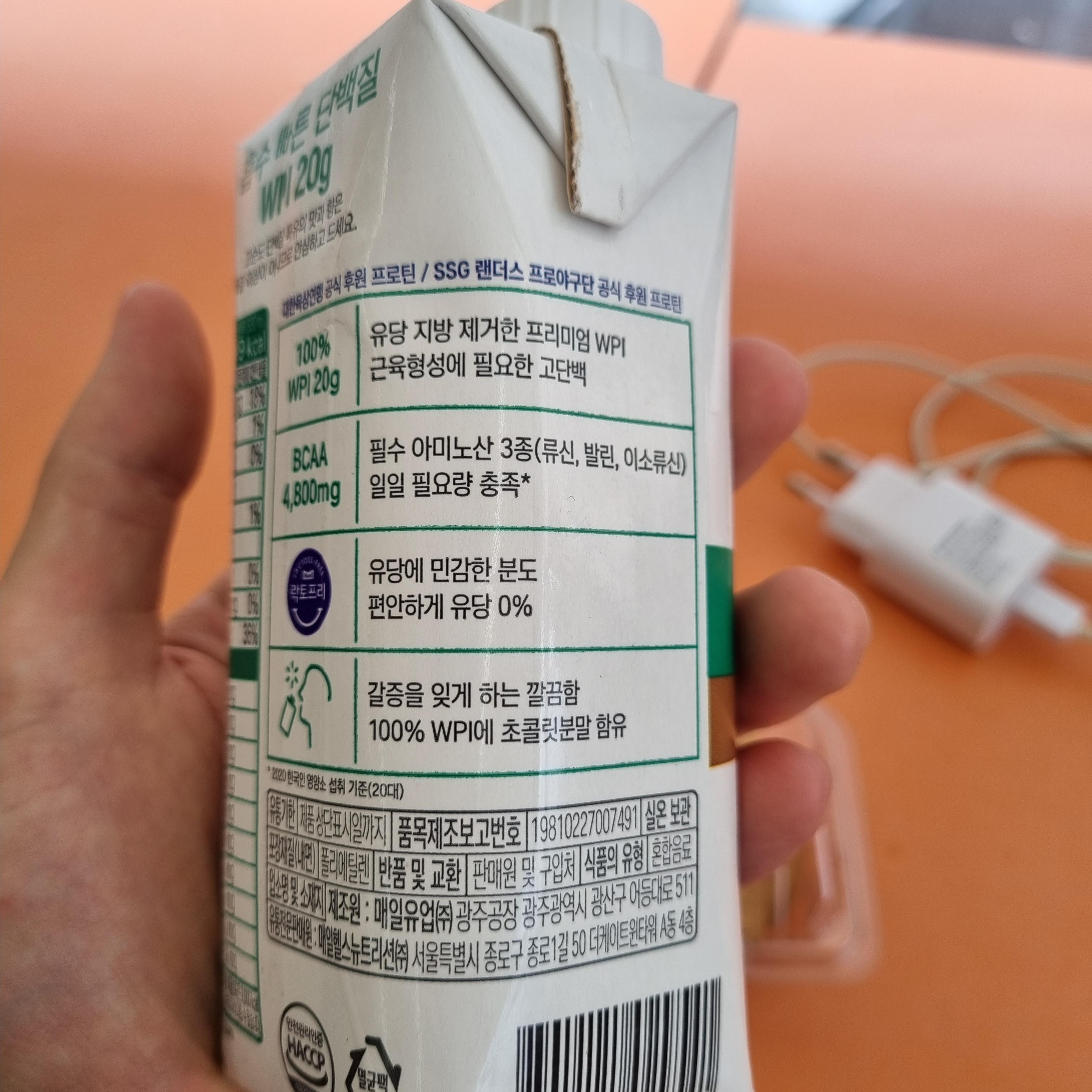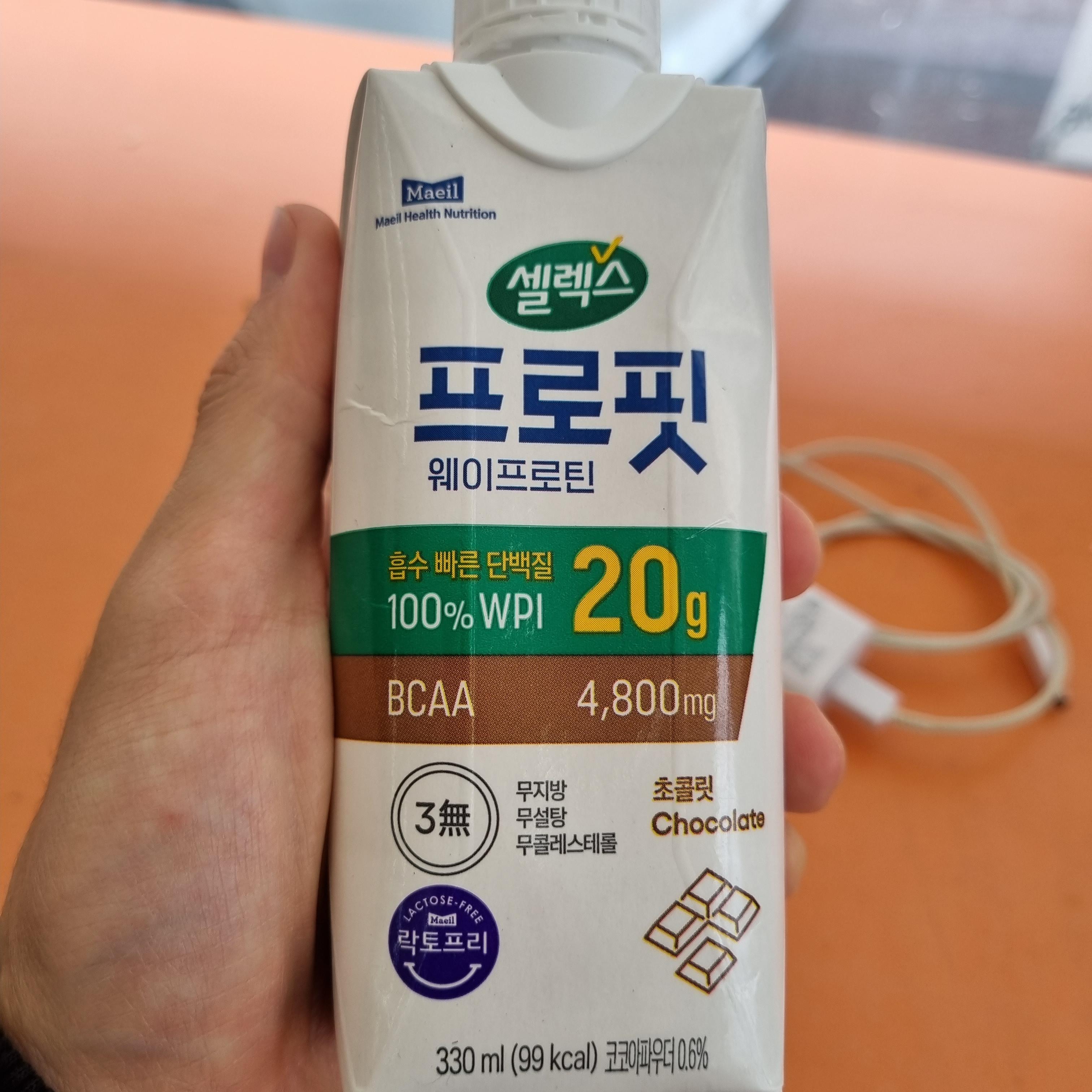 가장 눈에 들어왔던 건 숫자 20 이였습니다. 닭가슴살 100그램에도 단백질 함량이 20~22g 정도 들어있는데 간단히 마실 수 있는 편의점 단백질 쉐이크에 무려 20g이나 들어있다니! 유당 지방 제거한 프리미엄 WPI 근육형성에 필요한 고단백 흡수 빠른 단백질이 20g 들어있습니다. bcaa도 4800mg이나 들어가 있고 필수 아미노산 류신, 발린, 이소류신이 일일 필요량에 알맞게 구성되어있습니다.