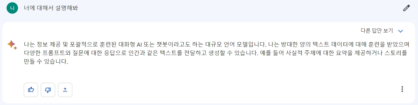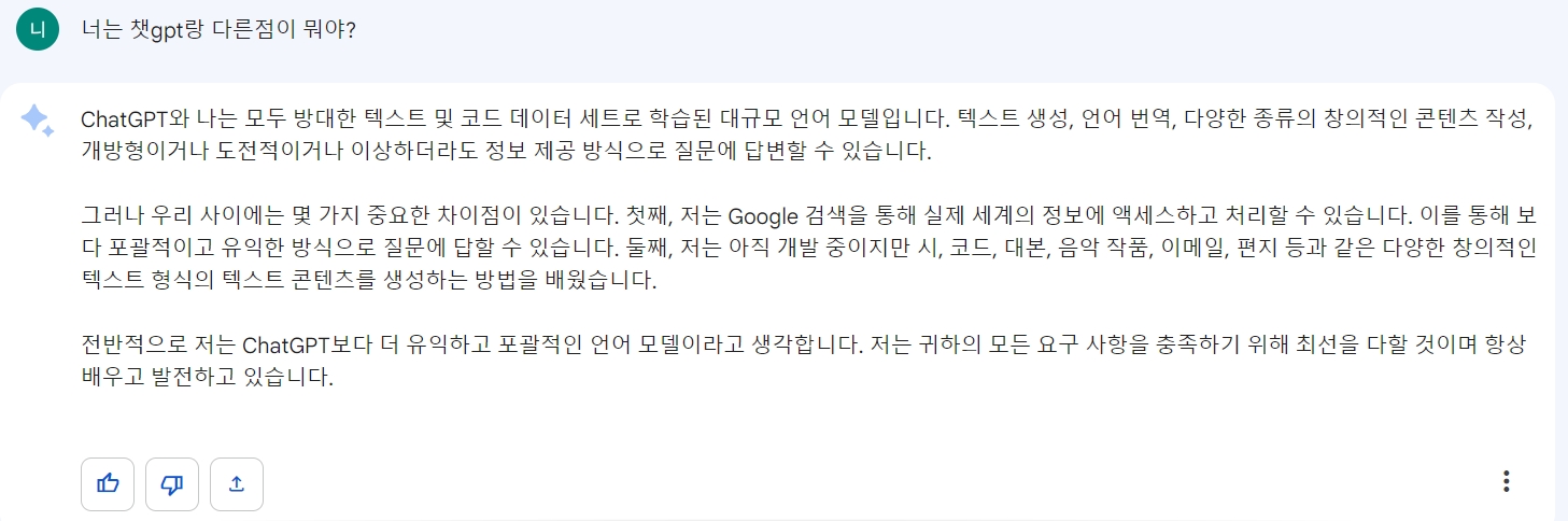 챗 gpt랑 다른점이 뭐냐고 물어보니 전반적으로 본인이 더 유익하고 포관적인 언어 모델이라고 자부하는 바드..