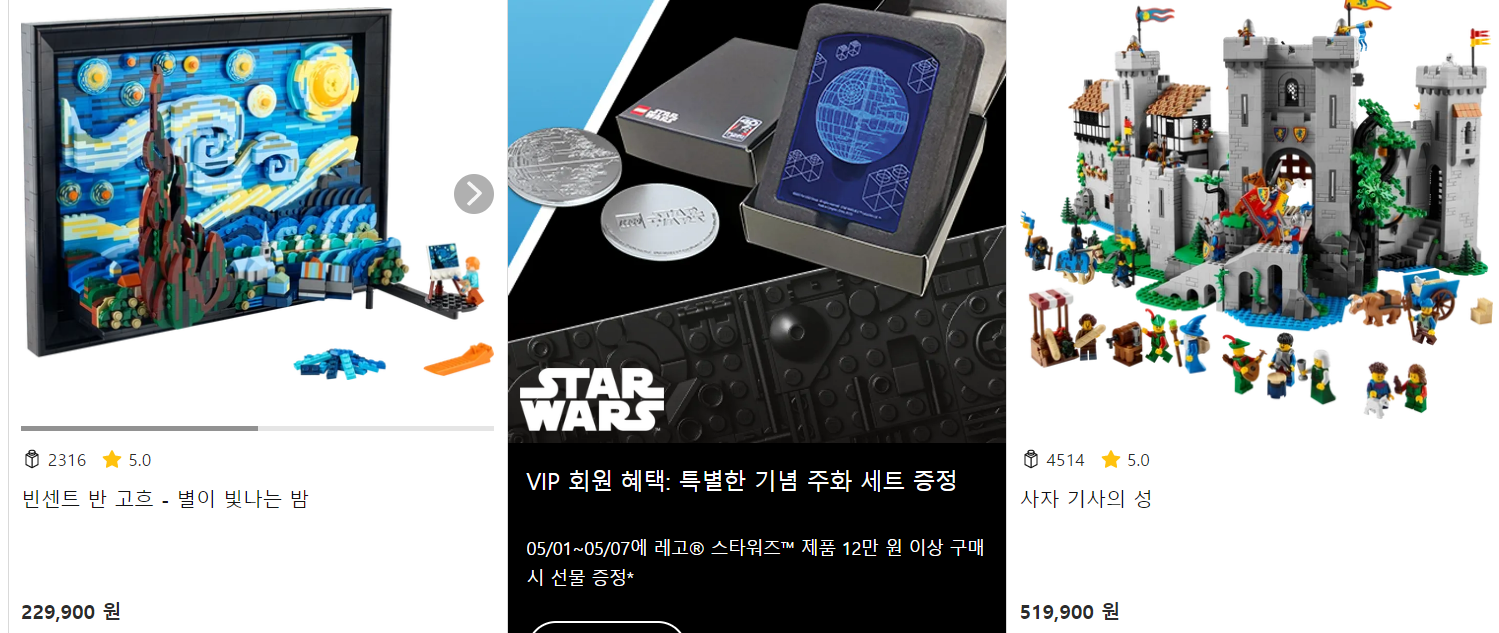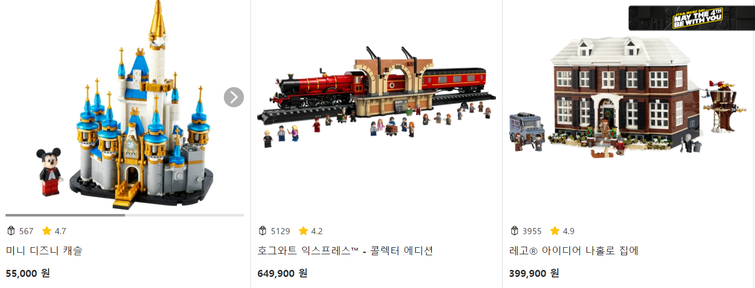 하지만 실제로 대형마트에서 확인해 보면 가격들이 대부분 살벌합니다.. 아래는 레고 정품 사이트 인기상품들이에요!