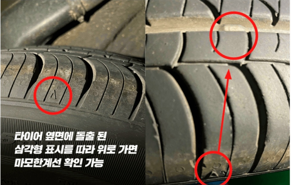 지금 바로 타이어를 확인해 보도록 하세요! 타이어 옆면에 돌출된 삼각형 모양을 찾고 트레드 홈 사이 마모 한계선이라는 것을 확인할 수 있습니다. 마모의 정도가 심하면 마모한계선이 양옆 트레드와 비슷한 높이가 됩니다.