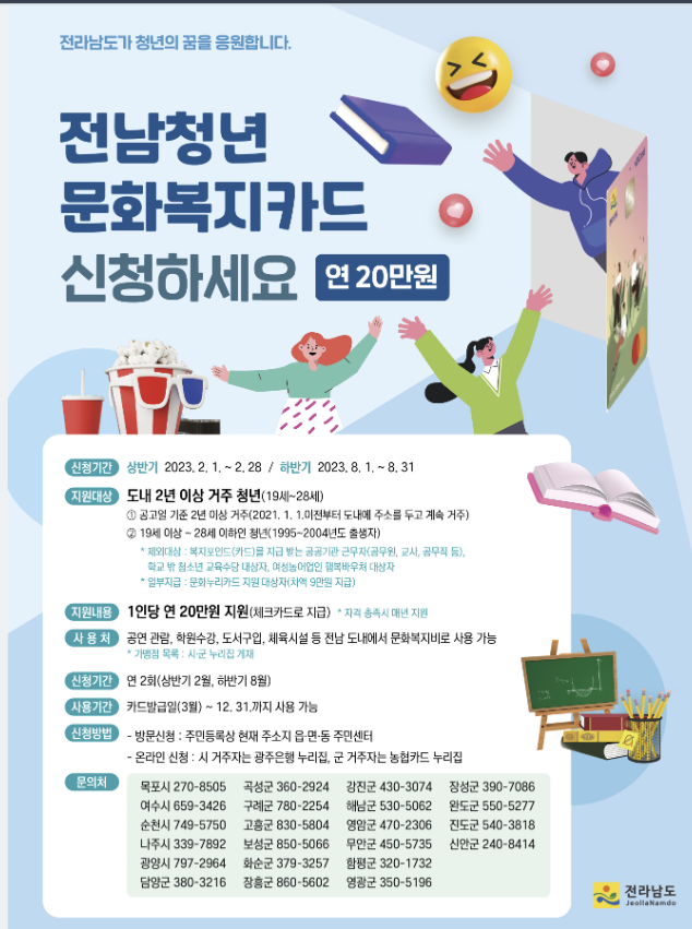 전남청년 문화복지카드는 전라남도와 시군에서 청년들의 문화생활 향휴 및 자기계발을 위해 건강한 삶을 누릴 수 있도록 정부에서 지원해 주는 20만원 개꿀 해택을 받을수있는 좋은 제도이니 어서 입소문 내서 받을 수 있도록 해봅시다!
